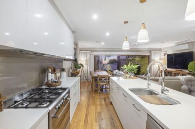 On the ground floor, a welcoming entrance leads to the lock-up garage and guest bathroom, before opening to a light-filled guest bedroom and laundry. Continue down the hallway to discover expansive open-plan living, where a sleek modern kitchen with breakfast bench overlooks a tranquil garden atrium. The adjoining dining and living spaces flow seamlessly to an entertaining deck and private courtyard.