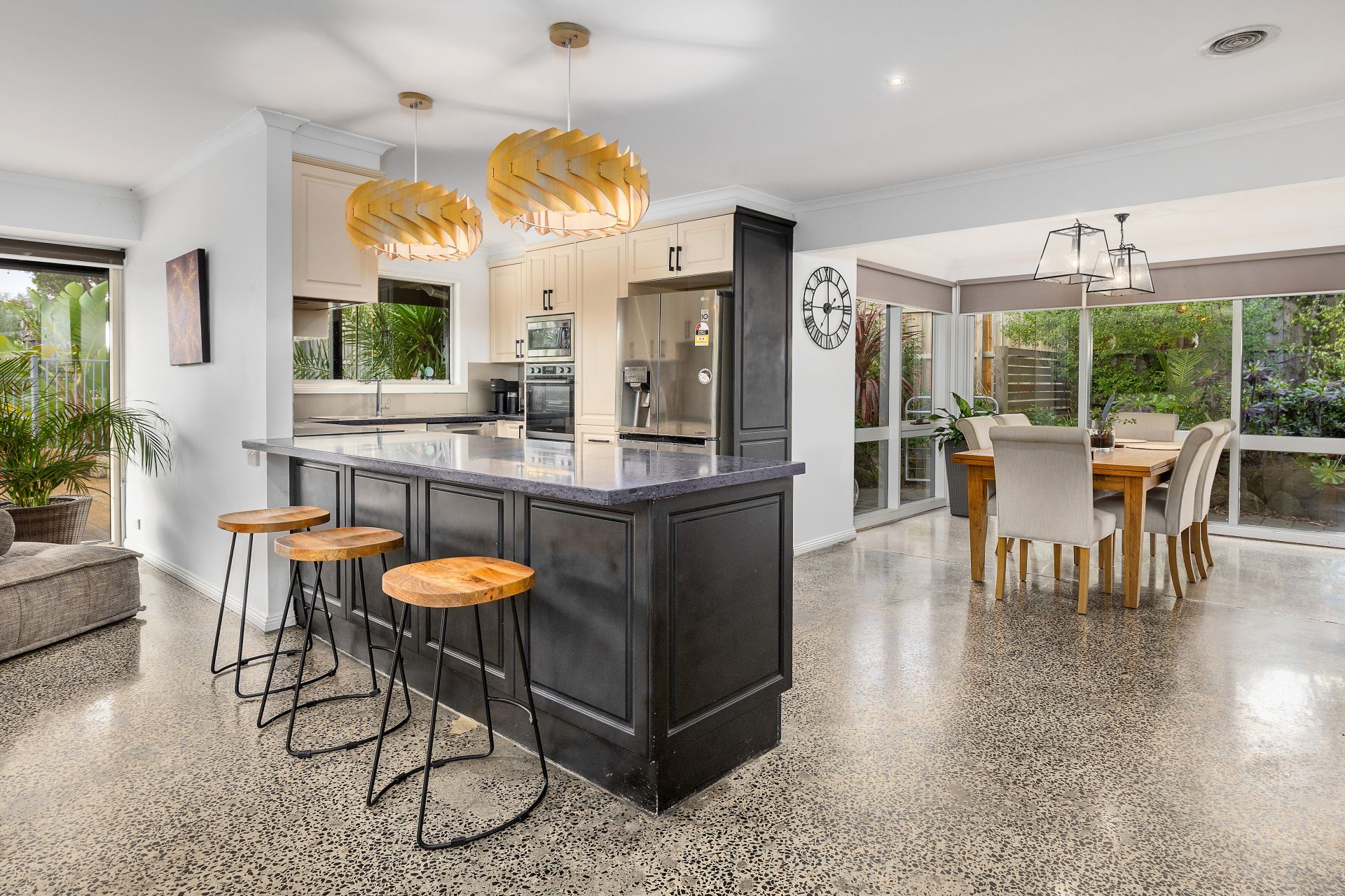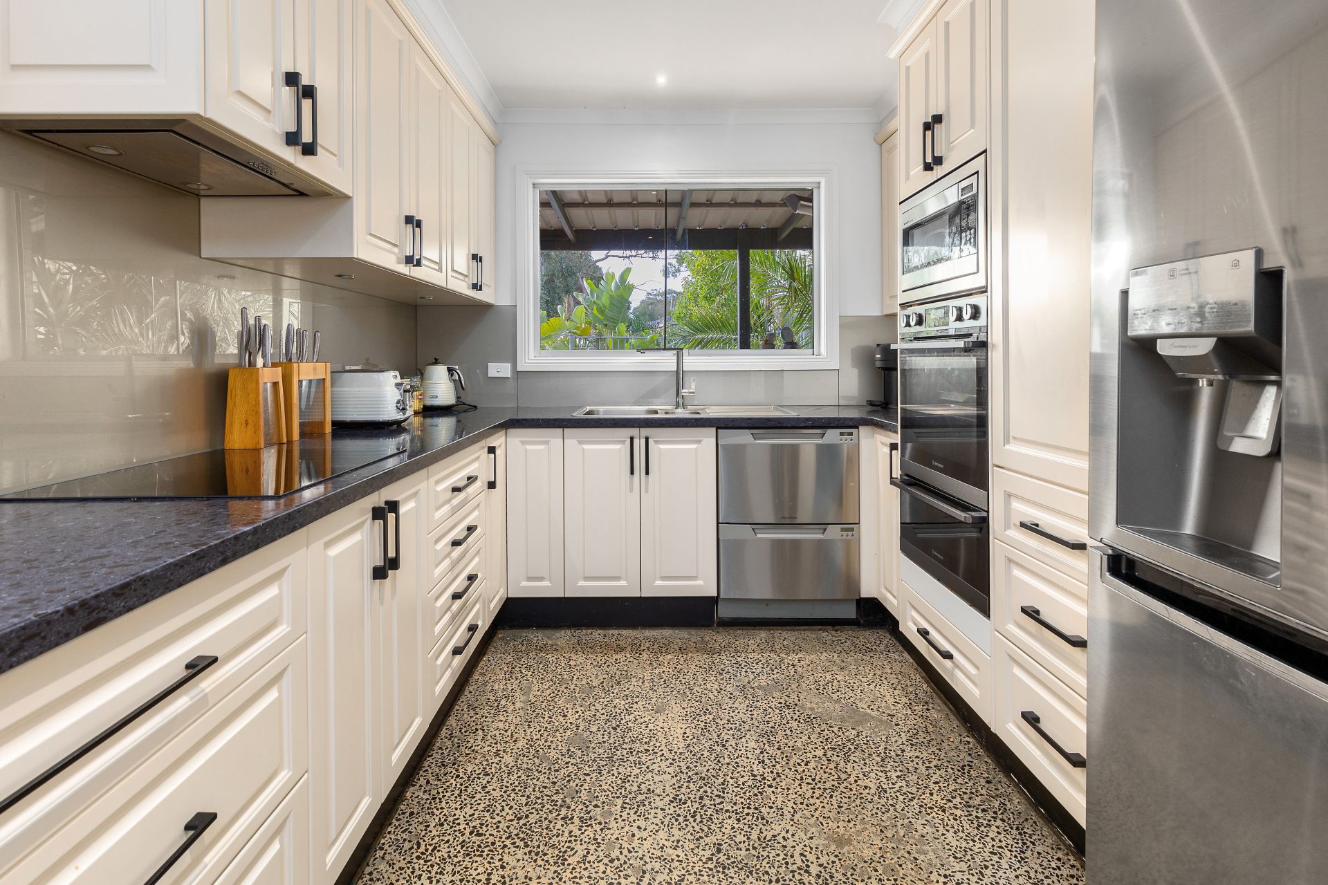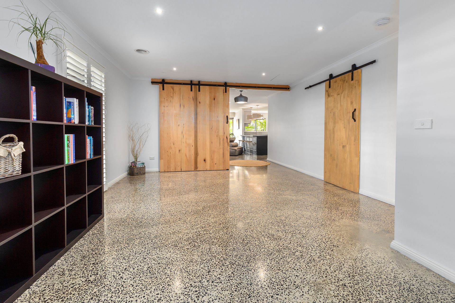 The home's blackened, bagged brick exterior gives way to an instantly engaging interior with stylishly enhanced polished concrete floors, floor to ceiling timber barn doors & spacious living areas where family living extends to the poolside deck for easy entertaining. The open-plan kitchen/meals zone with server window is light drenched & impressively appointed with granite benchtops, a new Westinghouse dual oven, in-built microwave oven, induction cooktop and stainless-steel twin-drawer dishwasher.