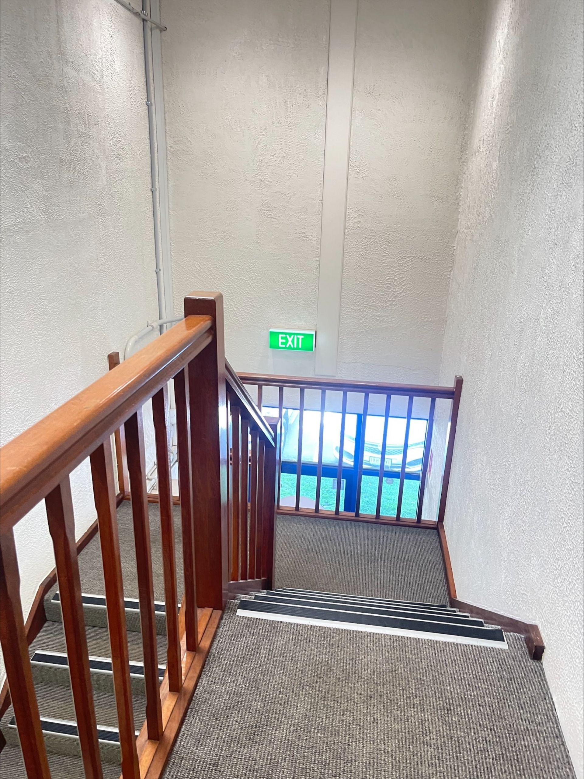 Communal entrance leads to the 1st Floor office with several partitioned areas over-looking the village parking.