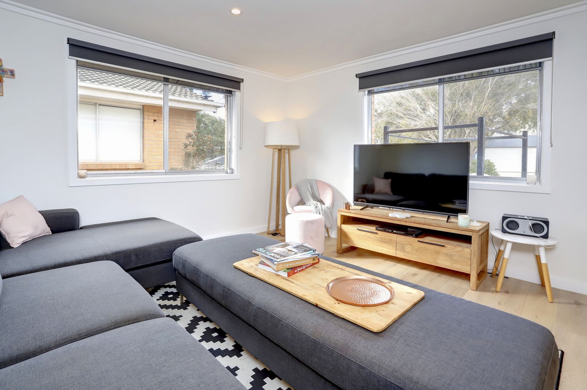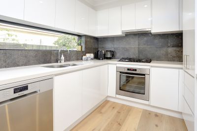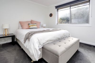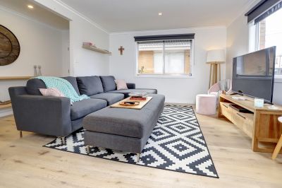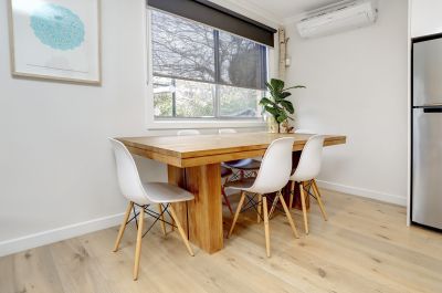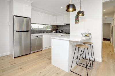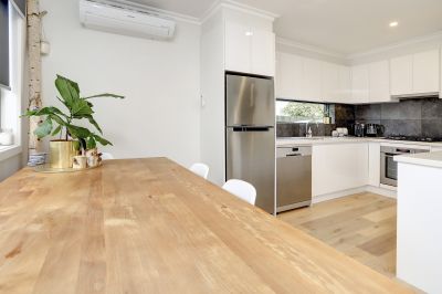 This beautifully refurbished three-bedroom unit combines modern comfort with a prime Mornington location. Warm floorboards flow through the main living areas, complementing the open-plan kitchen, dining, and lounge. The kitchen impresses with generous storage, extensive bench space, gas cooking, stainless steel appliances, and a feature window framing garden views.