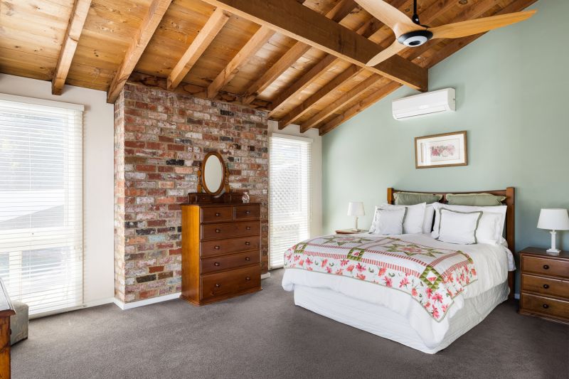 The well-endowed master bedroom with rustic exposed brick feature wall, vaulted ceiling beams, a split-system, walk-in robe and ensuite crowns the upper level of the abode, which includes two additional ensuited bedrooms and a fourth bathroom with shower/tub combo.