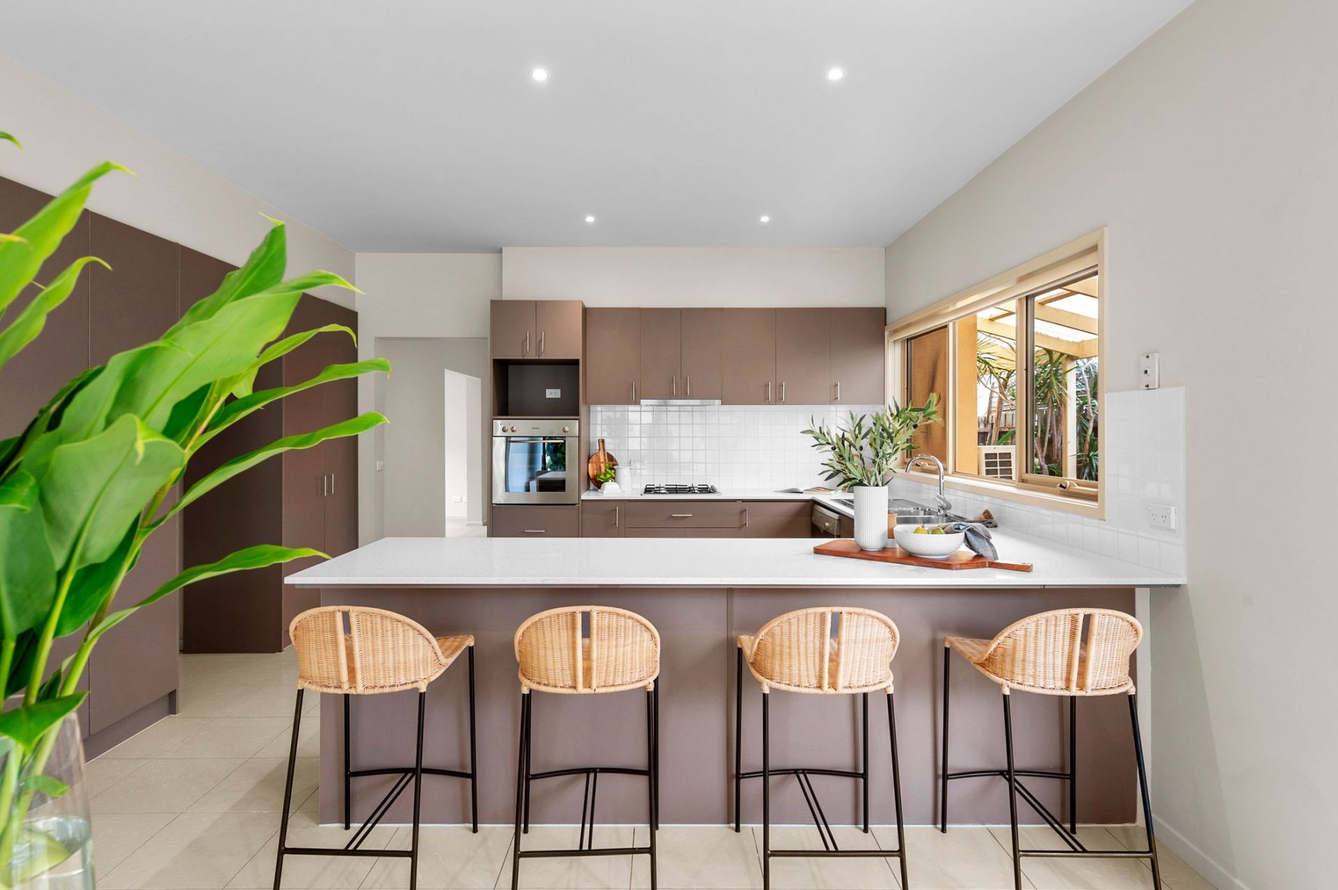 - Stone benchtops, ample kitchen storage, modern cooking appliances, dishwasher