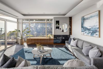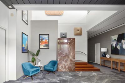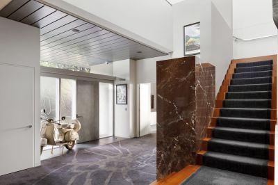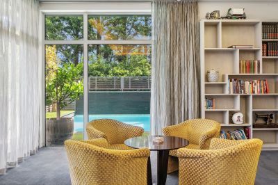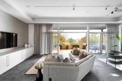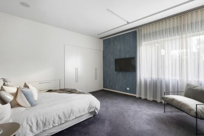 A grand custom glass entrance reveals the expansive family theatre domain with custom joinery, flowing to a deck and self-maintaining heated private pool cocooned by leafy magnolias. Enfolding the ground floor are two large bedrooms with bespoke painted walls, robes, and plush carpet, central to a stone-finished main bathroom with heated towel rails, hydronic flooring, and warm textural accents. A dedicated office complements the generous accommodation.