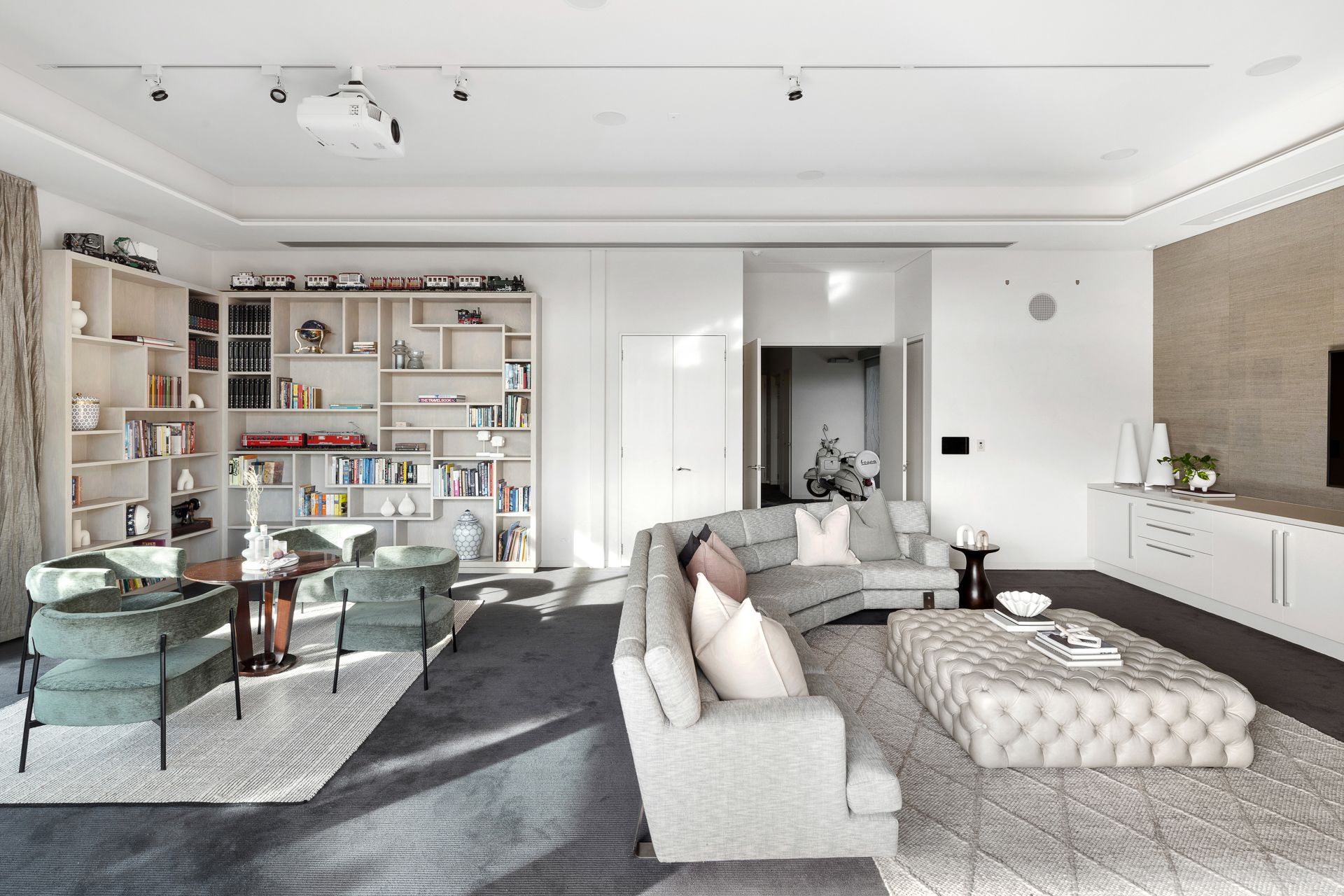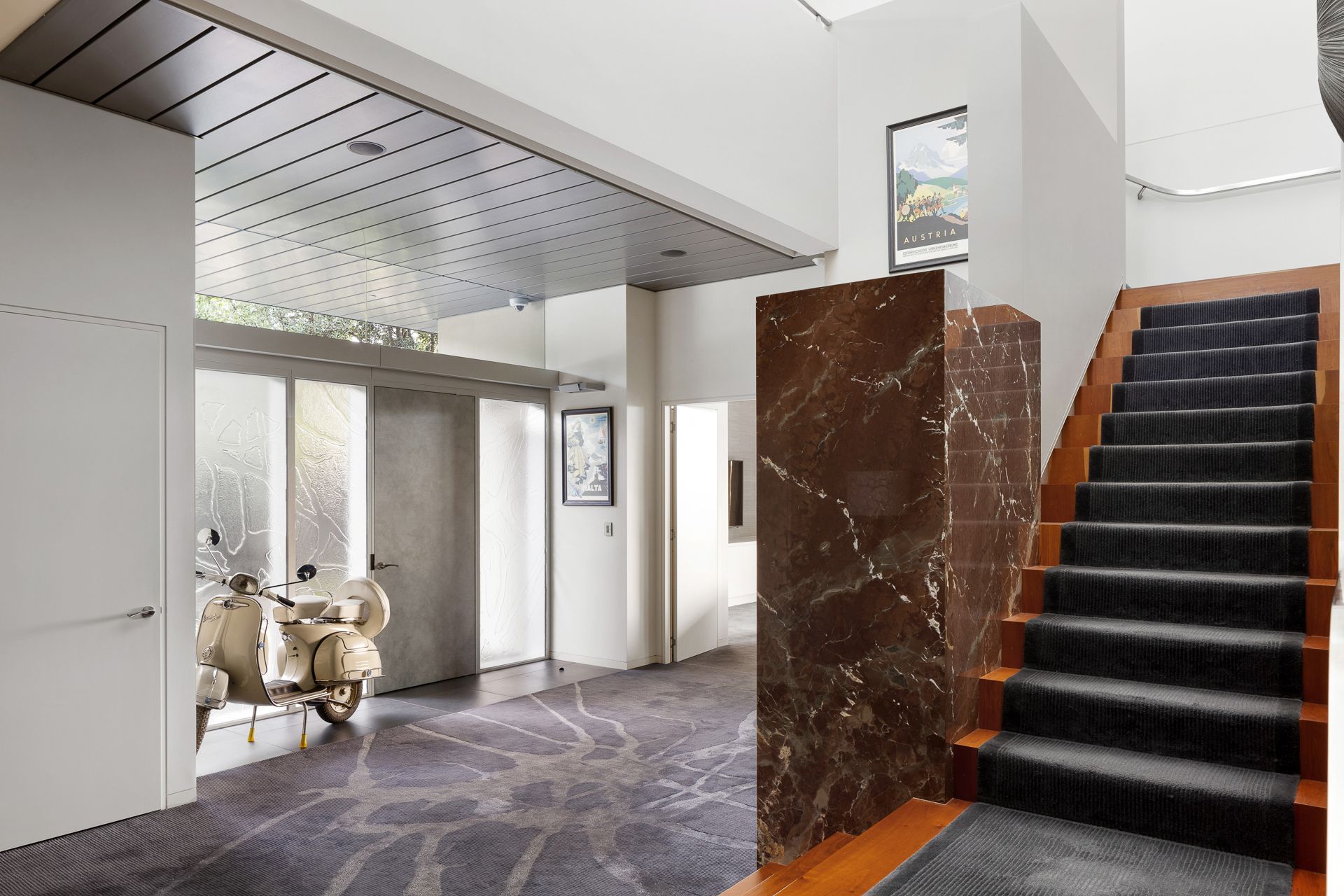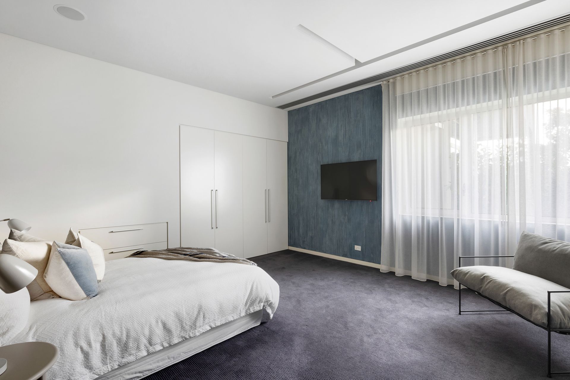 Ascending via the three-level lift or a central staircase adorned with silk lights sourced from the Middle East, you’re welcomed to panoramic views of Port Phillip Bay from the living and alfresco areas. The opulent master suite boasts a double dressing room and lavish bathroom, while the modern kitchen and butler’s pantry showcase marbled stone benchtops and a full suite of integrated Gaggenau appliances including double ovens, built-in microwave, induction cooktop, coffee machine, dishwasher, freezer, and refrigerator.