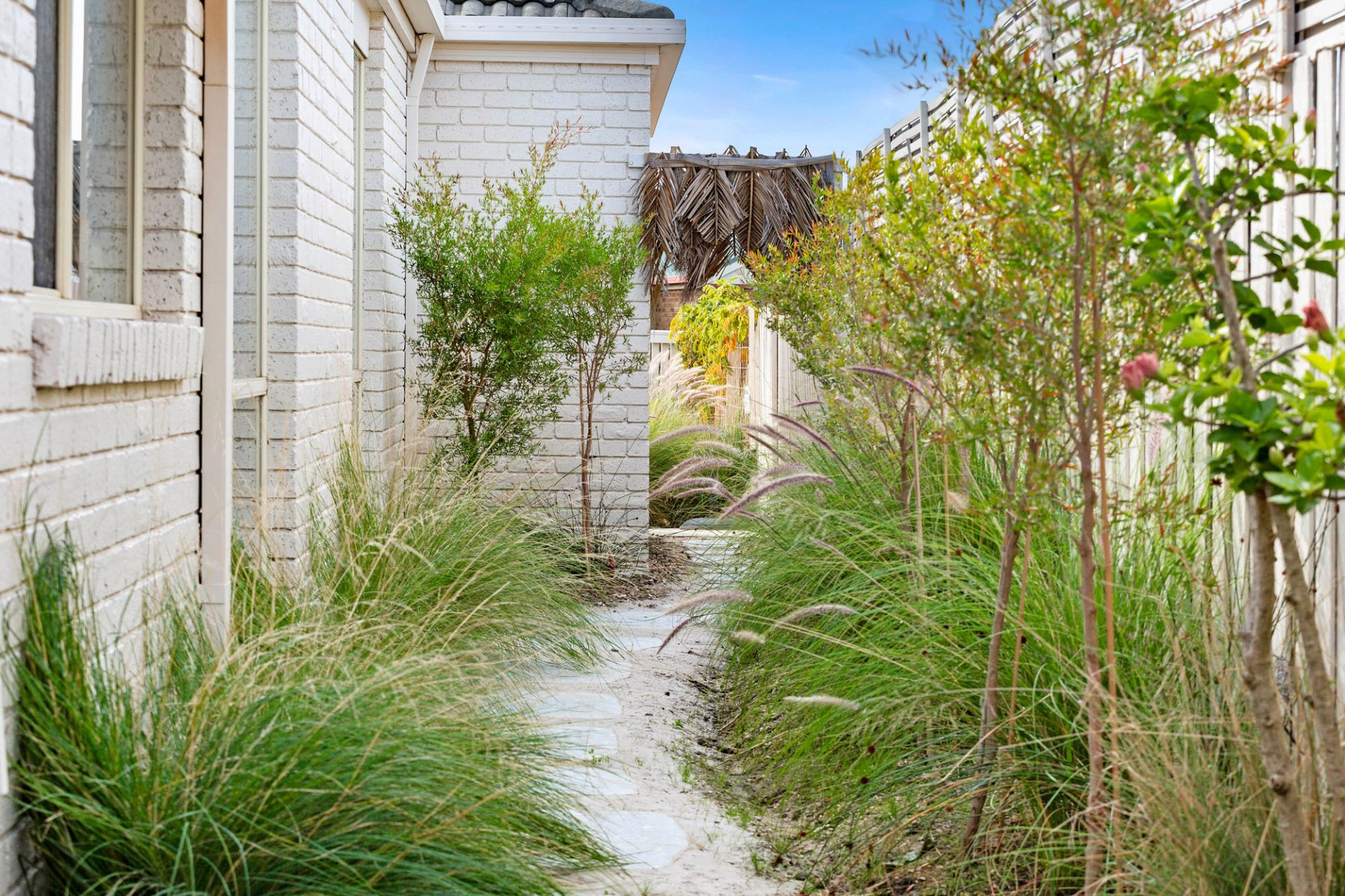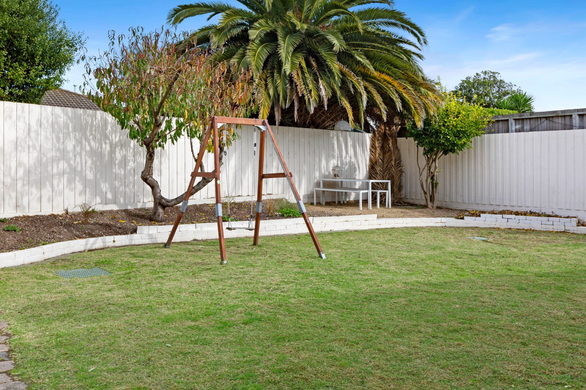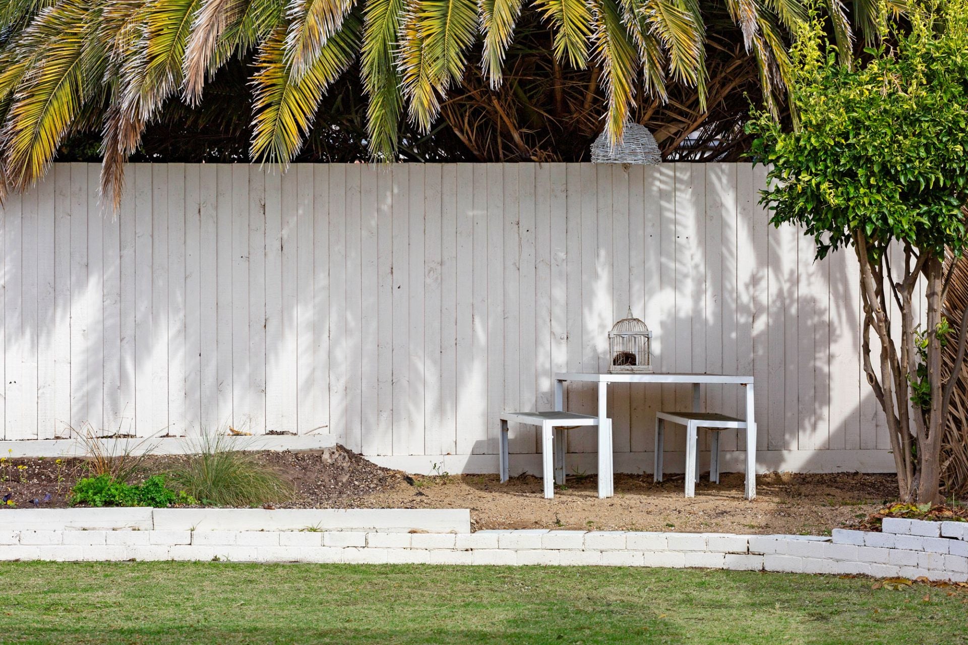 - Single level & painted brick behind tall fencing