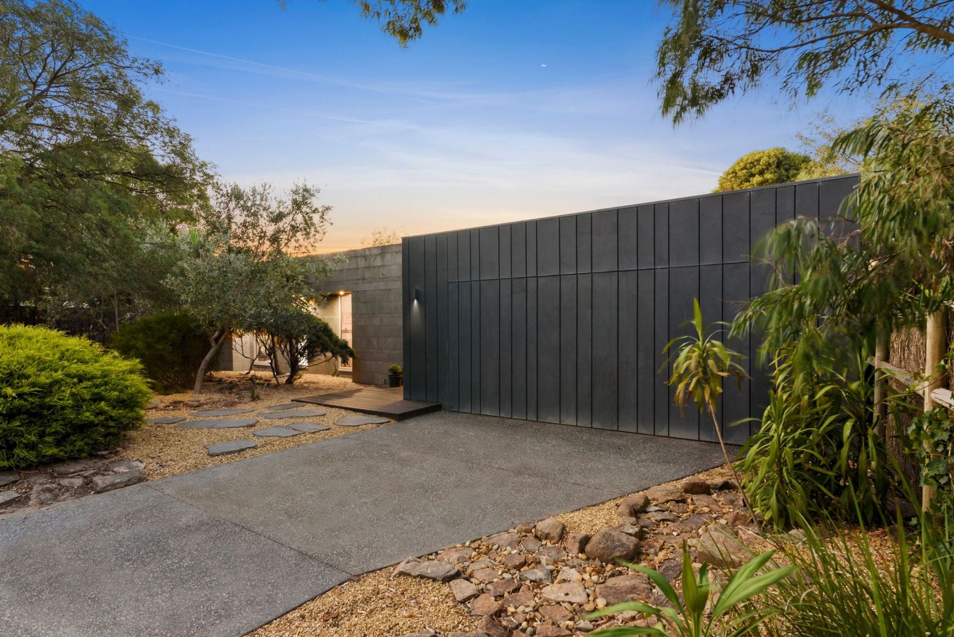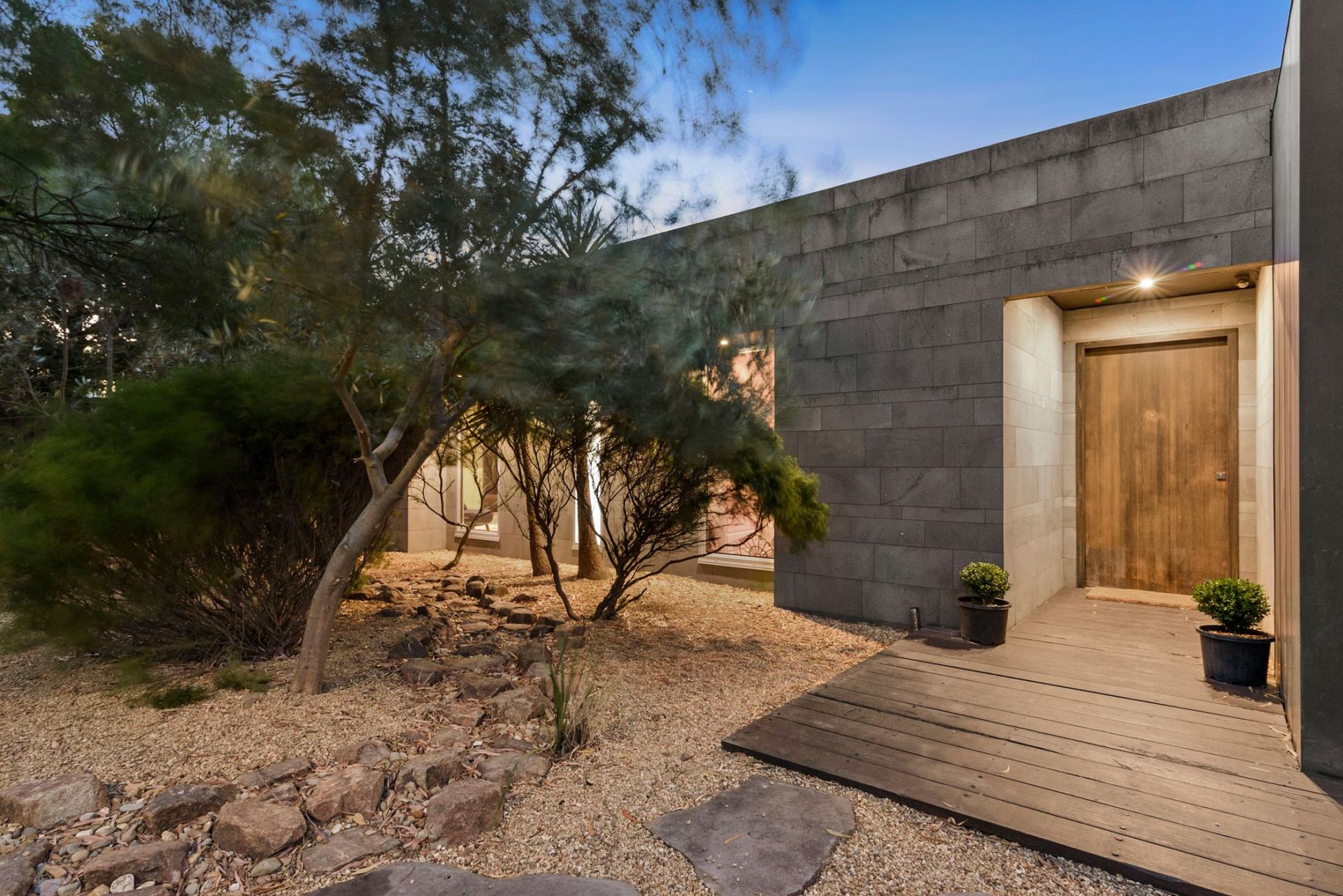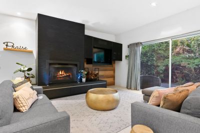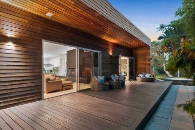 Celebrating architectural excellence extends across a striking contrast of Black Granite and Blackheart Sassafras benchtops embellished with the finest luxury appointments including Gaggenau stovetop, teppanyaki grill and dual ovens. Embraced with leather banquette seats the dining area flows on to nurture growing minds while the ambient glow of Jetmaster wood fire anchors the living area. Steeped in serenity a large timber alfresco overlooks a bamboo zen garden welcoming the leafy aspects indoors through oversized picture windows and glass slider.