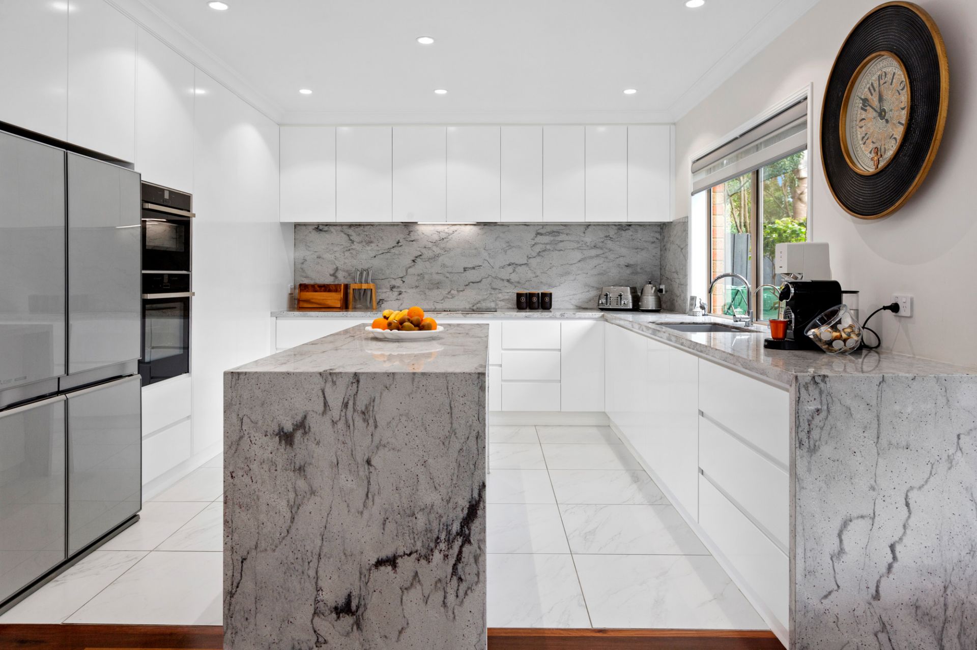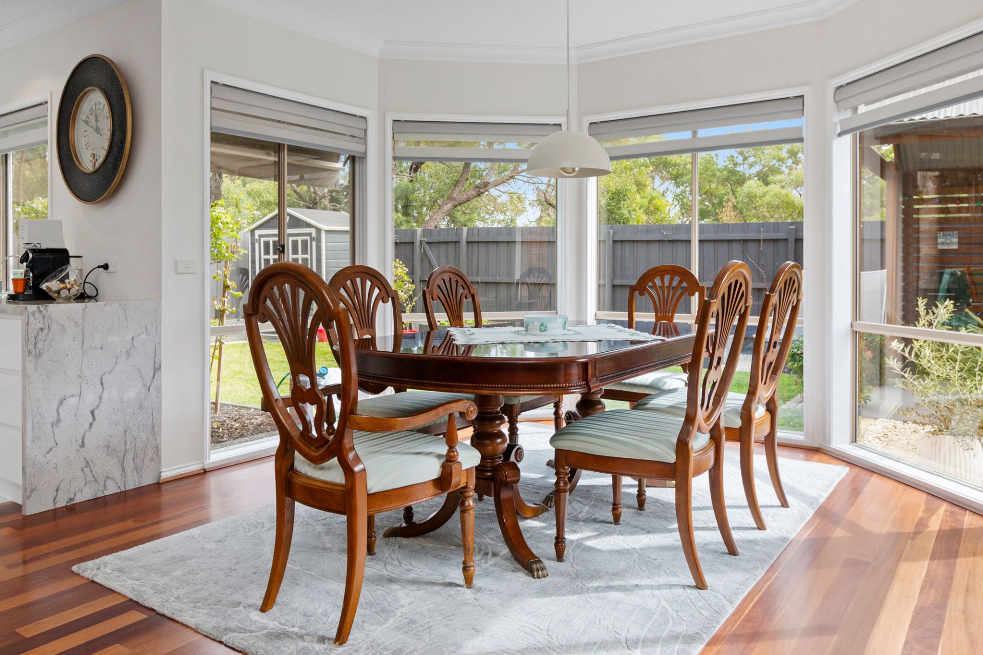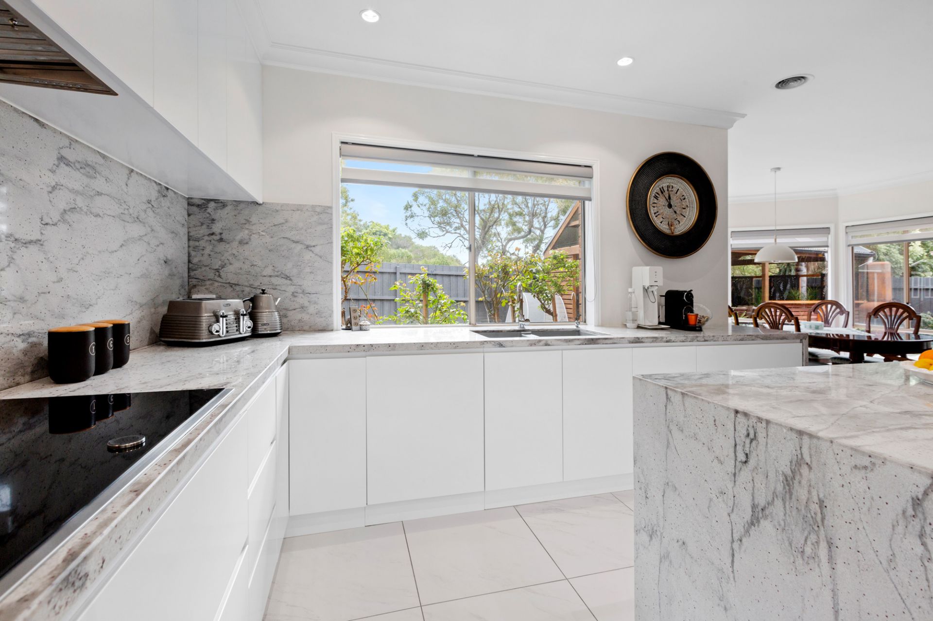 Georgian-style grandeur meets a stylish modern vibe in this five-bedroom residence defined by lavish space and high quality brand new interior finishes. With a spectacular entrance that steals the show with imperial split staircase and ironwork balustrading, the 40 square (approx.) home flaunts a striking open plan that instantly shows through to the entertaining lounge and dining rooms, family living and dining as well as to a larger upper level living zone. Graced with an exquisite new kitchen featuring stone benchtops and a full suite of Neff appliances, the high quality refurbished home also boasts a deluxe alfresco entertaining pavilion among the rear gardens. In an appealing family-friendly estate, just minutes from all seaside Mornington has to offer, a rear pedestrian gate opens onto a tranquil walking trail alongside the heritage rail line, while a nearby wetlands and recreation space as well as a shortcut to Main St.