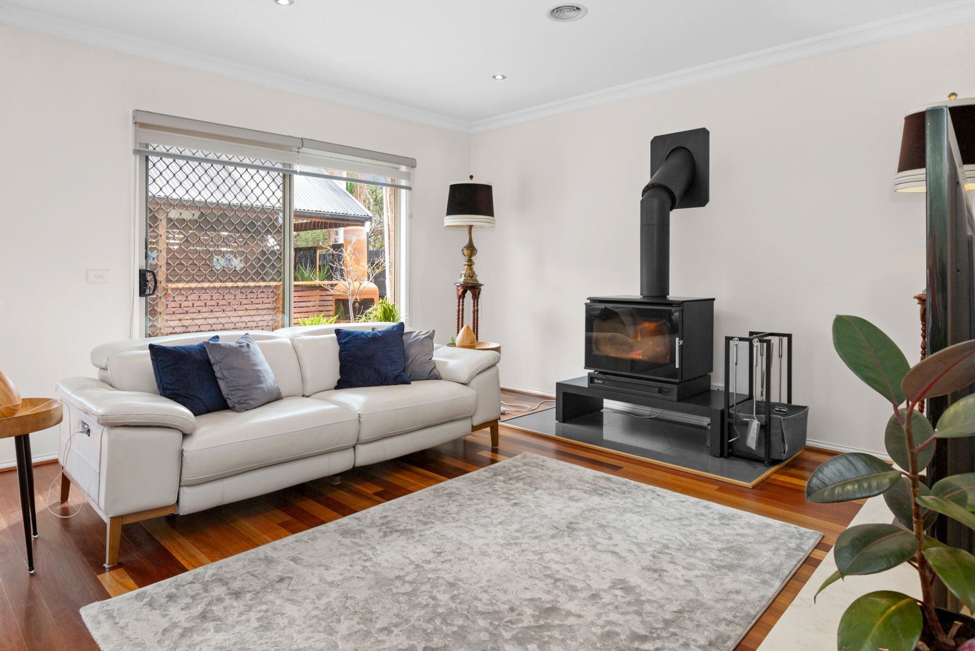 - Open plan family room with wood heater