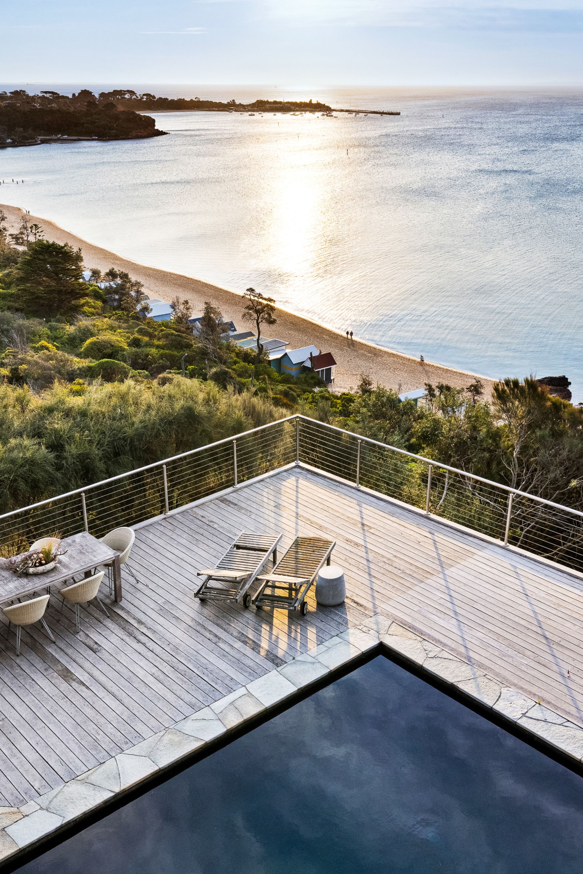 Harmoniously integrated amongst its stunning surrounds thanks to its cedar-clad exterior, expansive glass walls and multiple observation decks, the three-bedroom home opens to a central entertaining domain where multiple living and dining zones converge across a designer kitchen complete with Corian benchtops, Miele steamer and built-in coffee machine, and freestanding cooker. Three luxurious bedrooms and three stylish bathrooms cascade across the levels, including a lavish top-floor master retreat featuring an open ensuite with feature tub, walk-in robe and rear balcony where views span the Mornington Pier and harbour, Yacht Club, Life Saving Club and the Bellarine Peninsula.