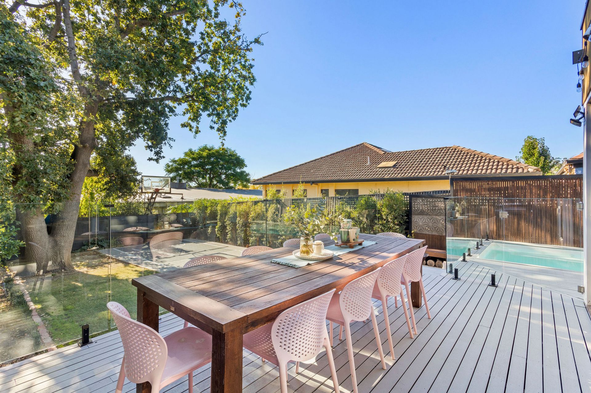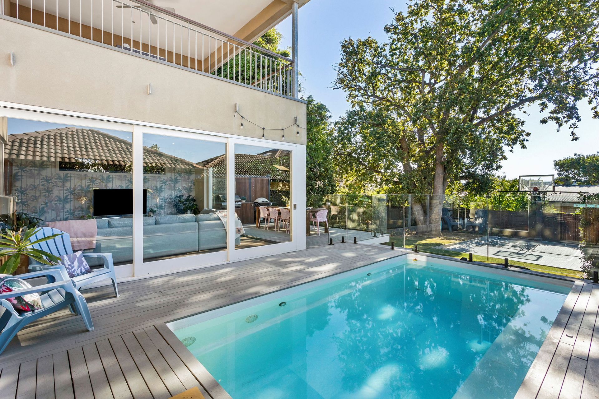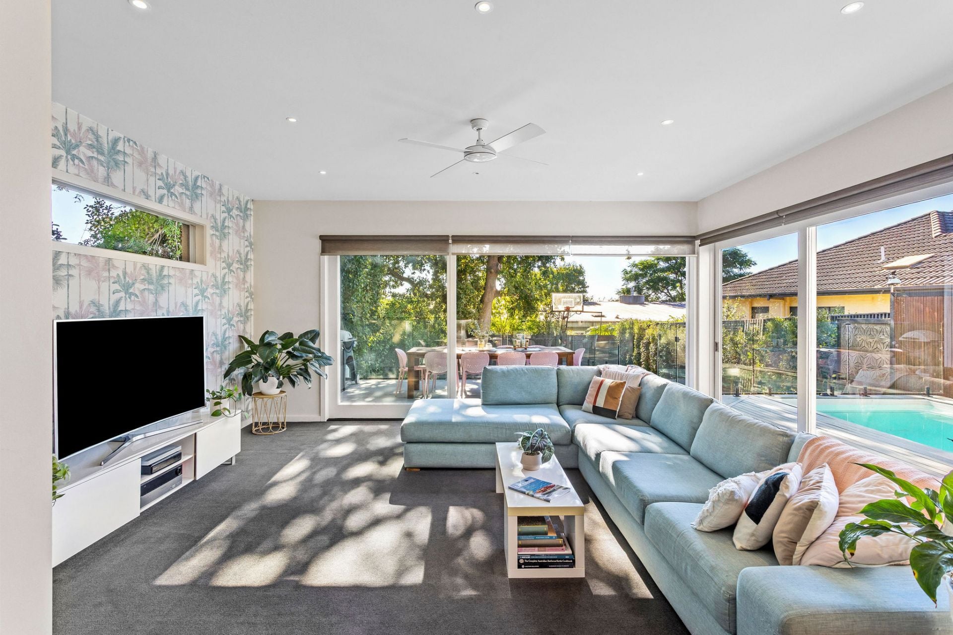 Rear walls of glass help keep an eye on the kids as they enjoy the gas-heated spa-jetted-pool and DreamCourts basketball area, while the gentle sway of established trees provides just the right amount of shade across the private backyard. Three generous bedrooms and a renovated bathroom sit separately to the first-floor master retreat, where a walk-through robe, ensuite, and a north-facing rear deck with Port Phillip Bay aspects pamper parents.
