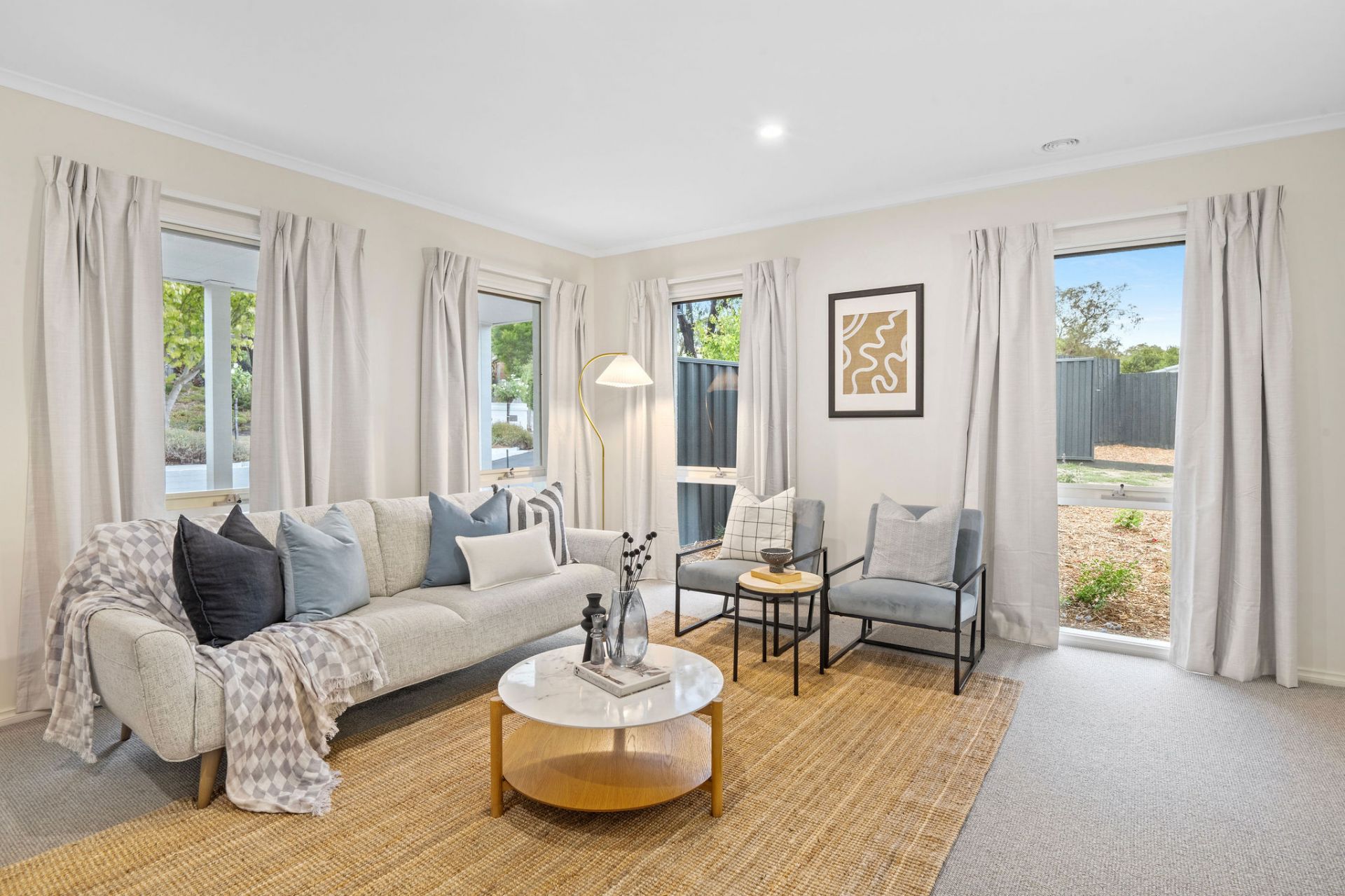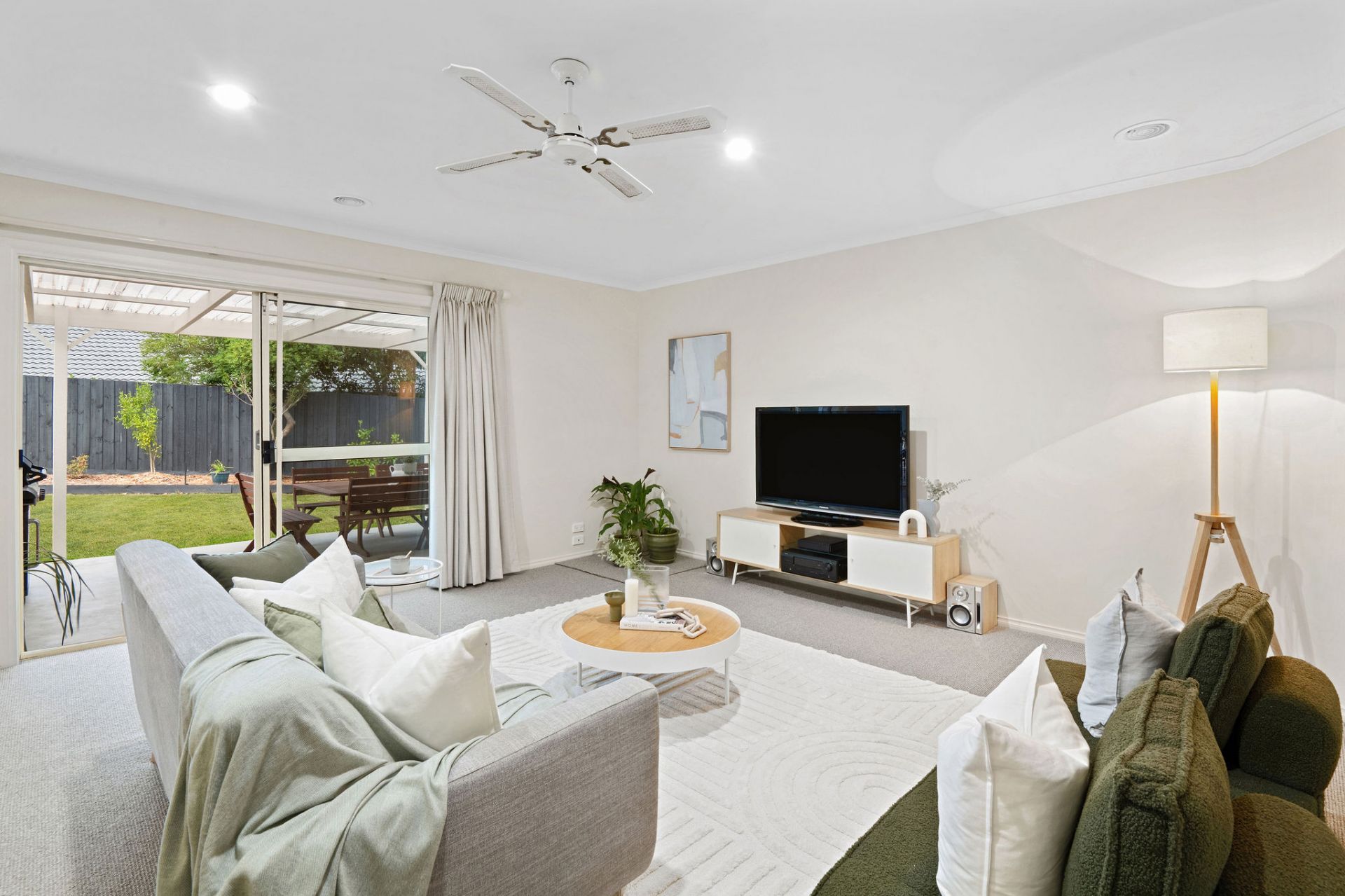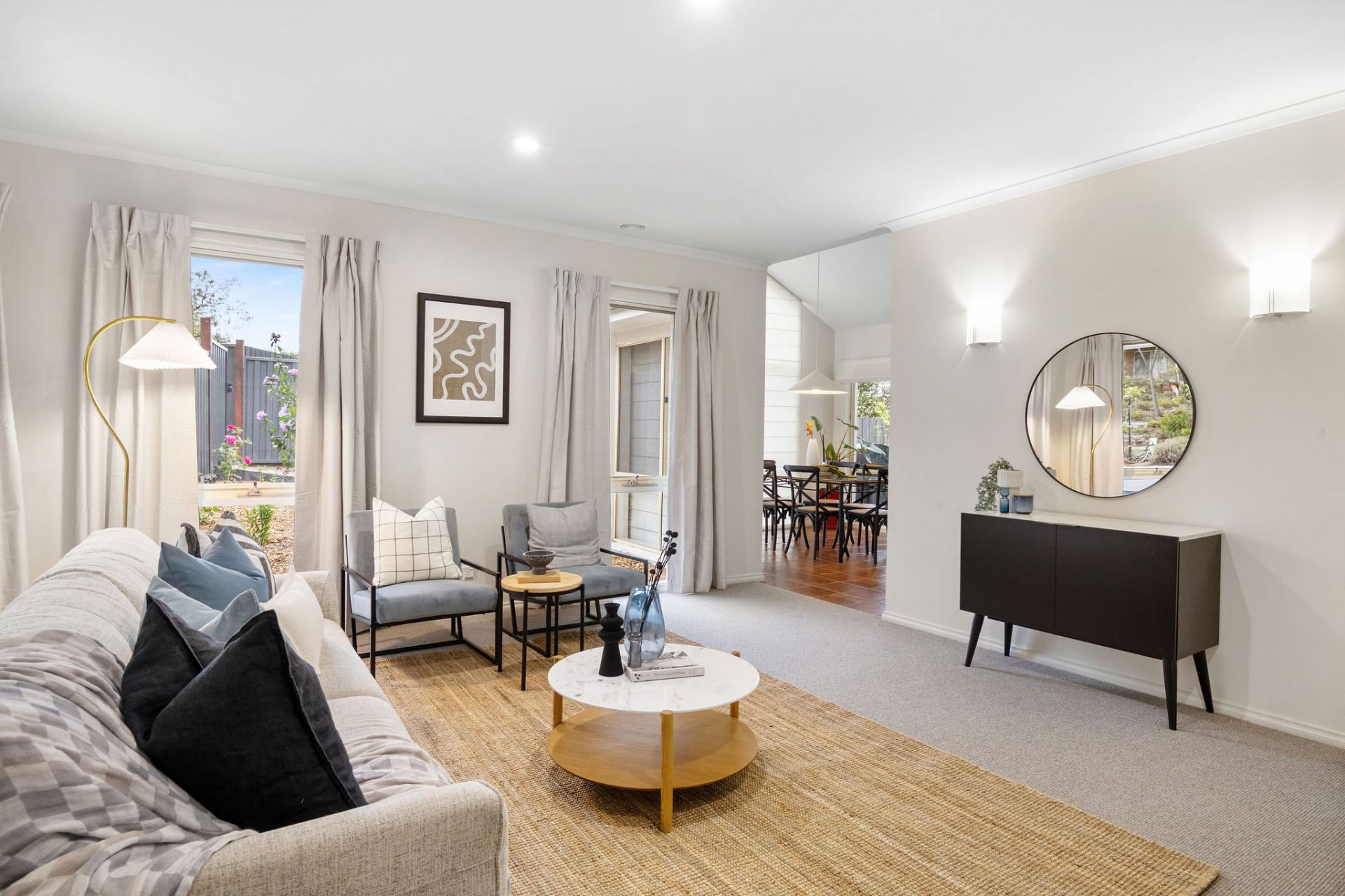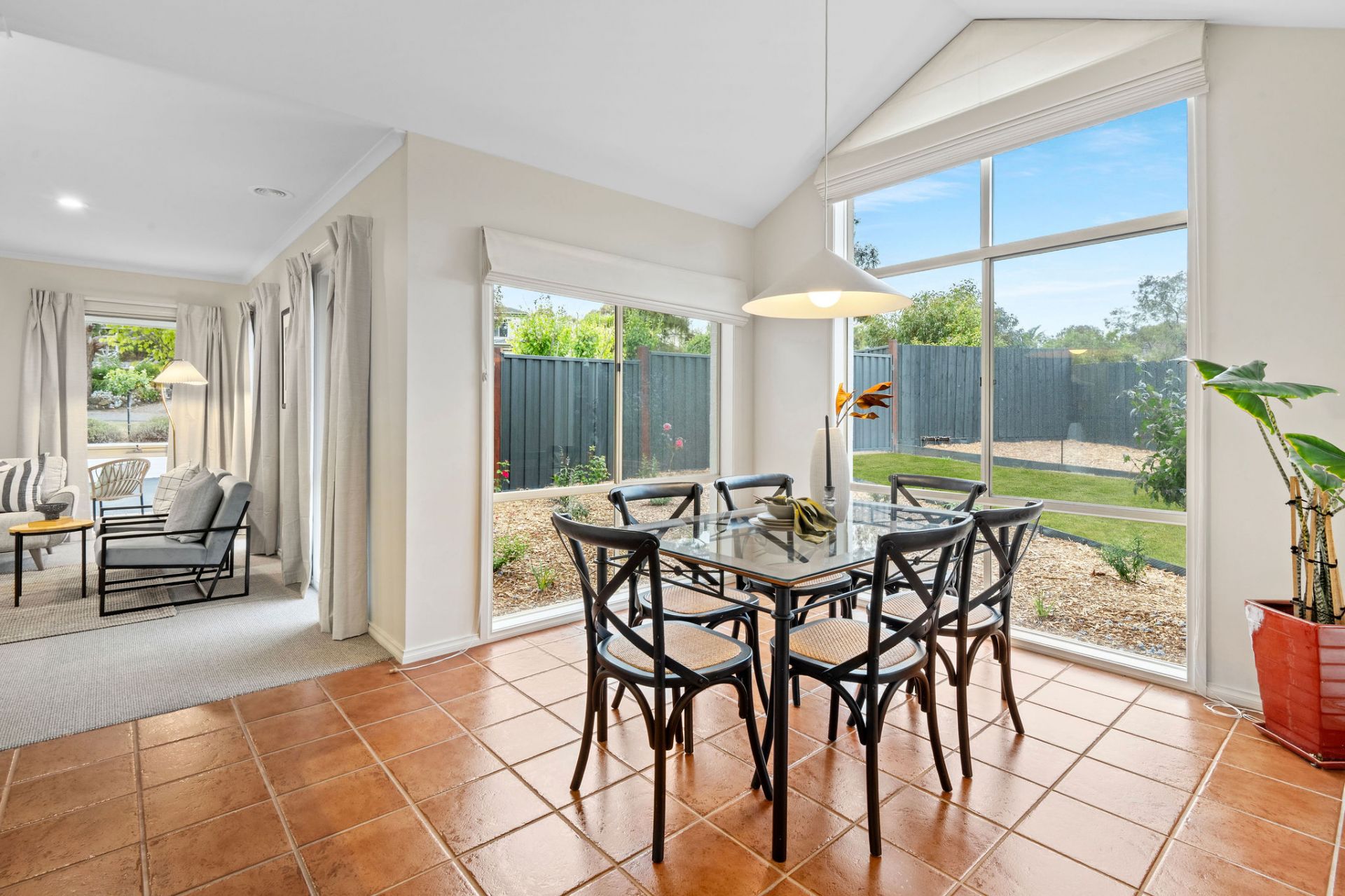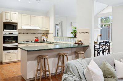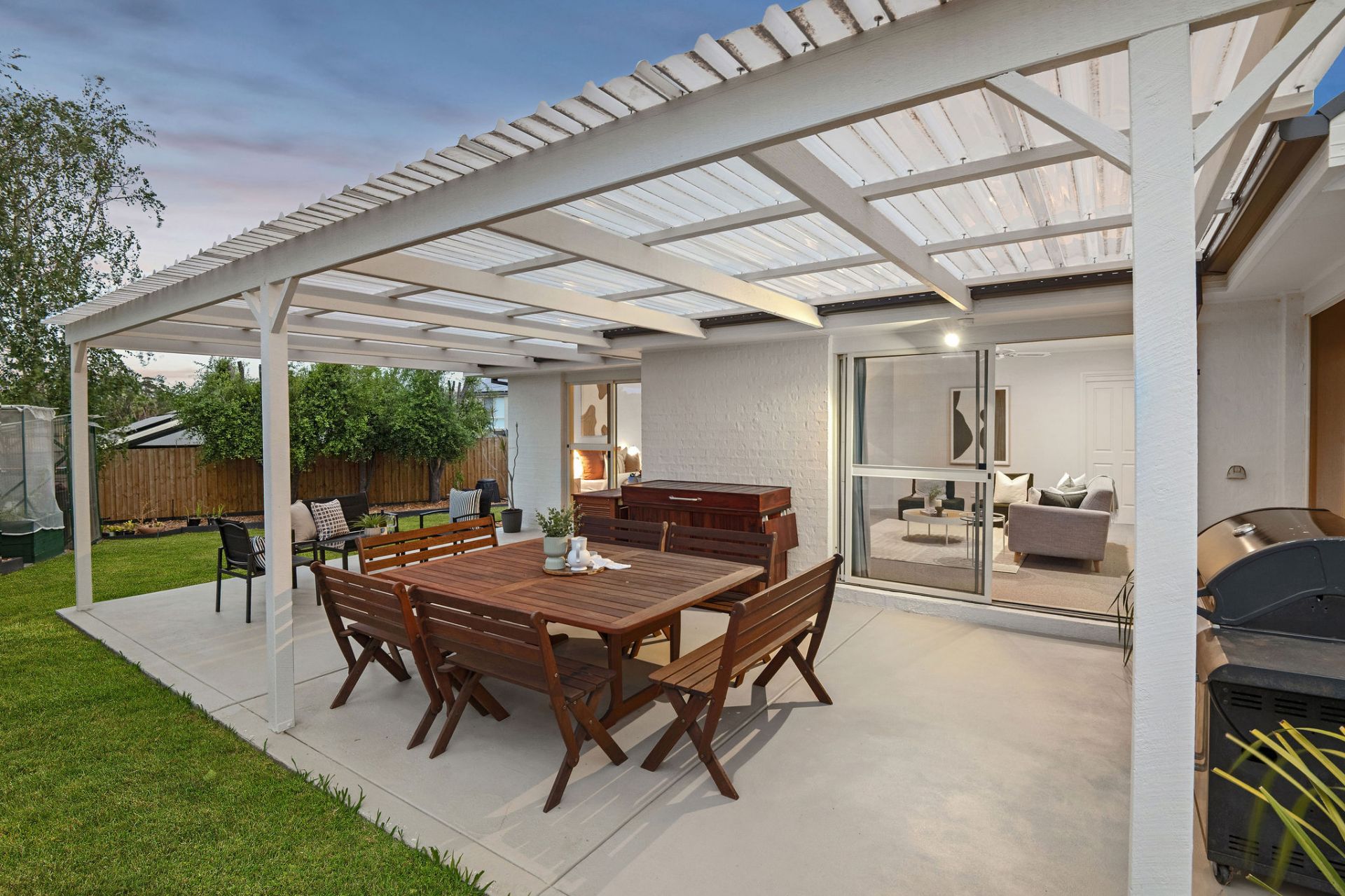 Enhanced for comfort and updated for style, a crisp white rendered exterior masks a breezy interior, where resilient surfaces promise lasting durability across high-traffic areas. A natural flow of entertaining moves between two open living zones, anchored by a central dining space and practical kitchen, featuring Westinghouse cooking appliances, dishwasher, and breakfast bar overhang, all beneath cathedral ceilings.