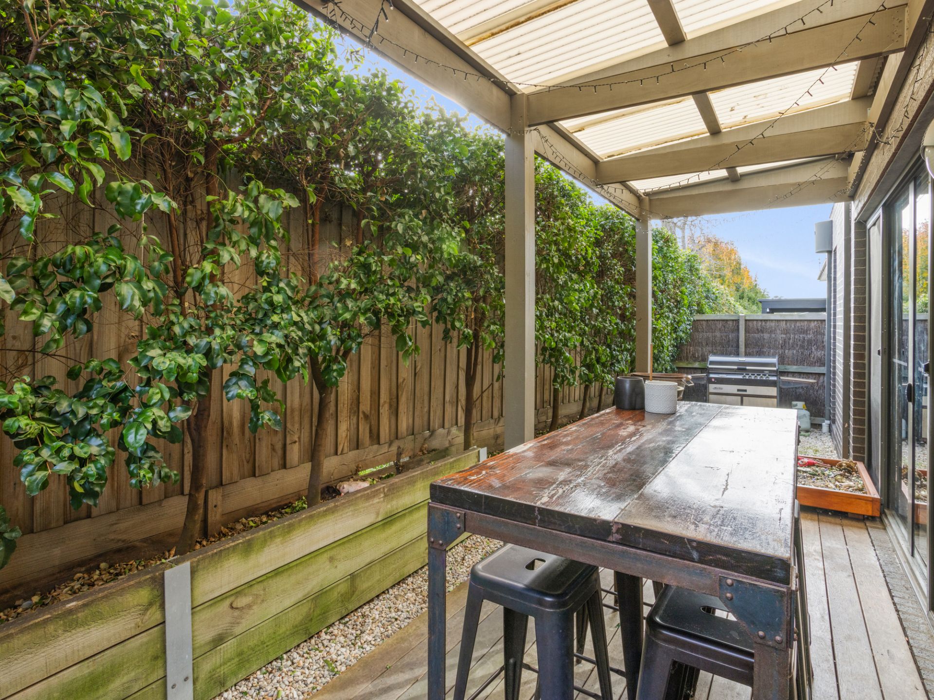- Outdoor pergola and low maintenance gardens