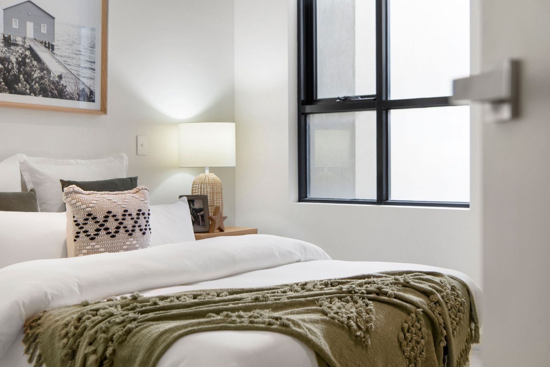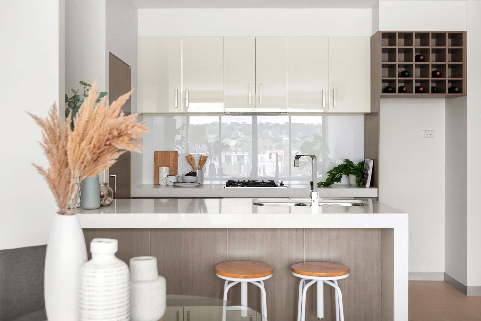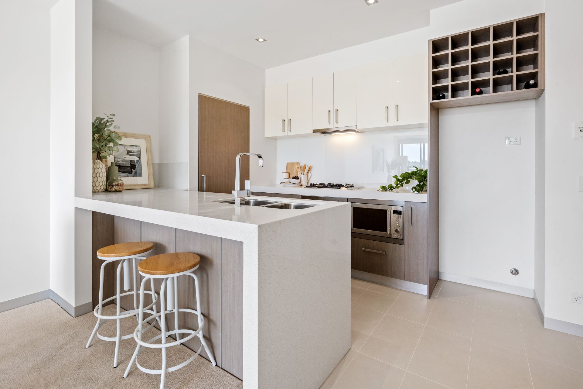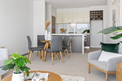 Bathed in natural light and infused with a serene seaside vibe, the 6.5-metre open-plan living and dining area seamlessly extends to a private balcony ideal for unwinding to water views and gentle bay breezes. Designed with both form and function in mind, the stylish kitchen features a cascading stone breakfast bar, wine shelving, sleek cream and woodgrain finishes, and premium Smeg appliances.