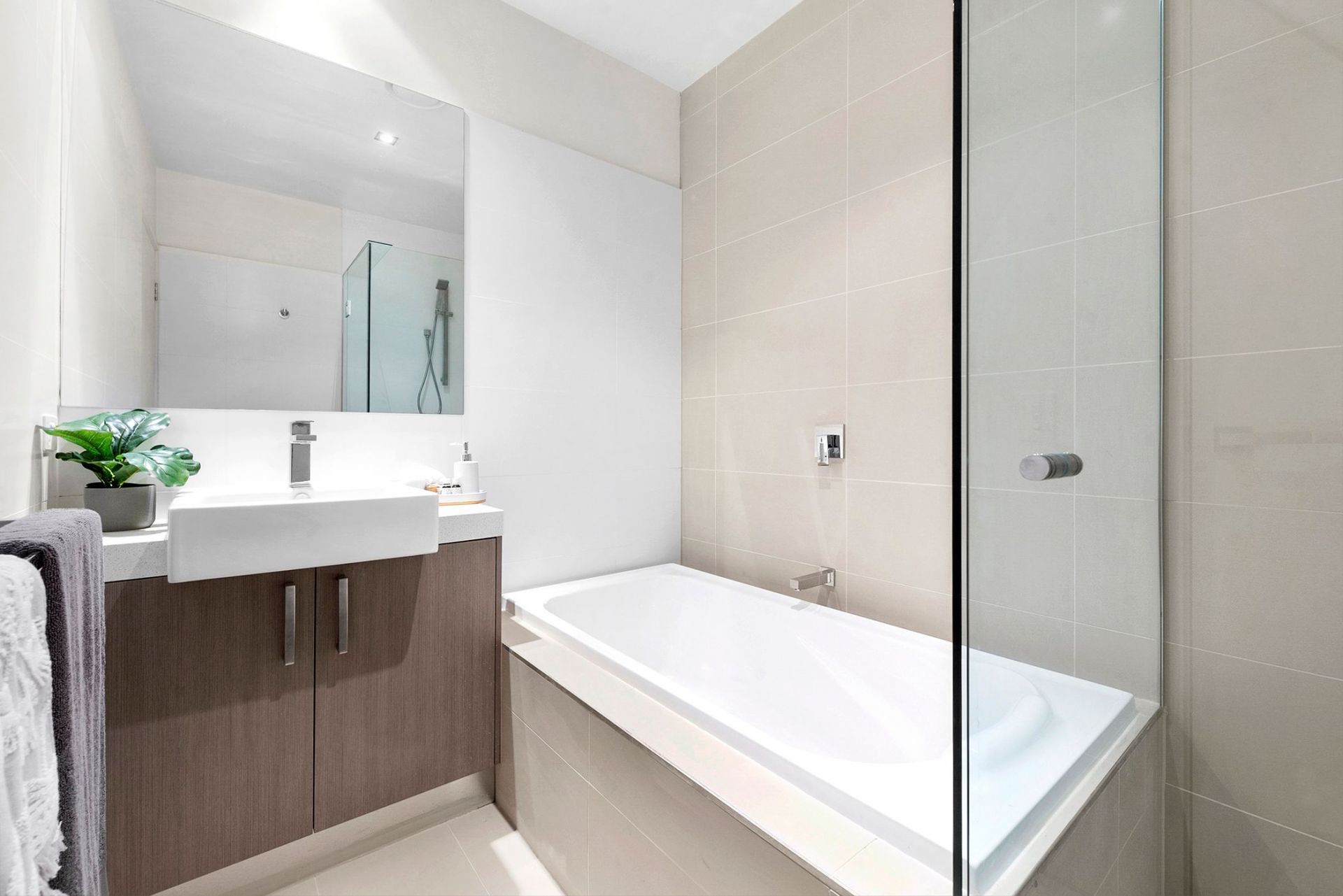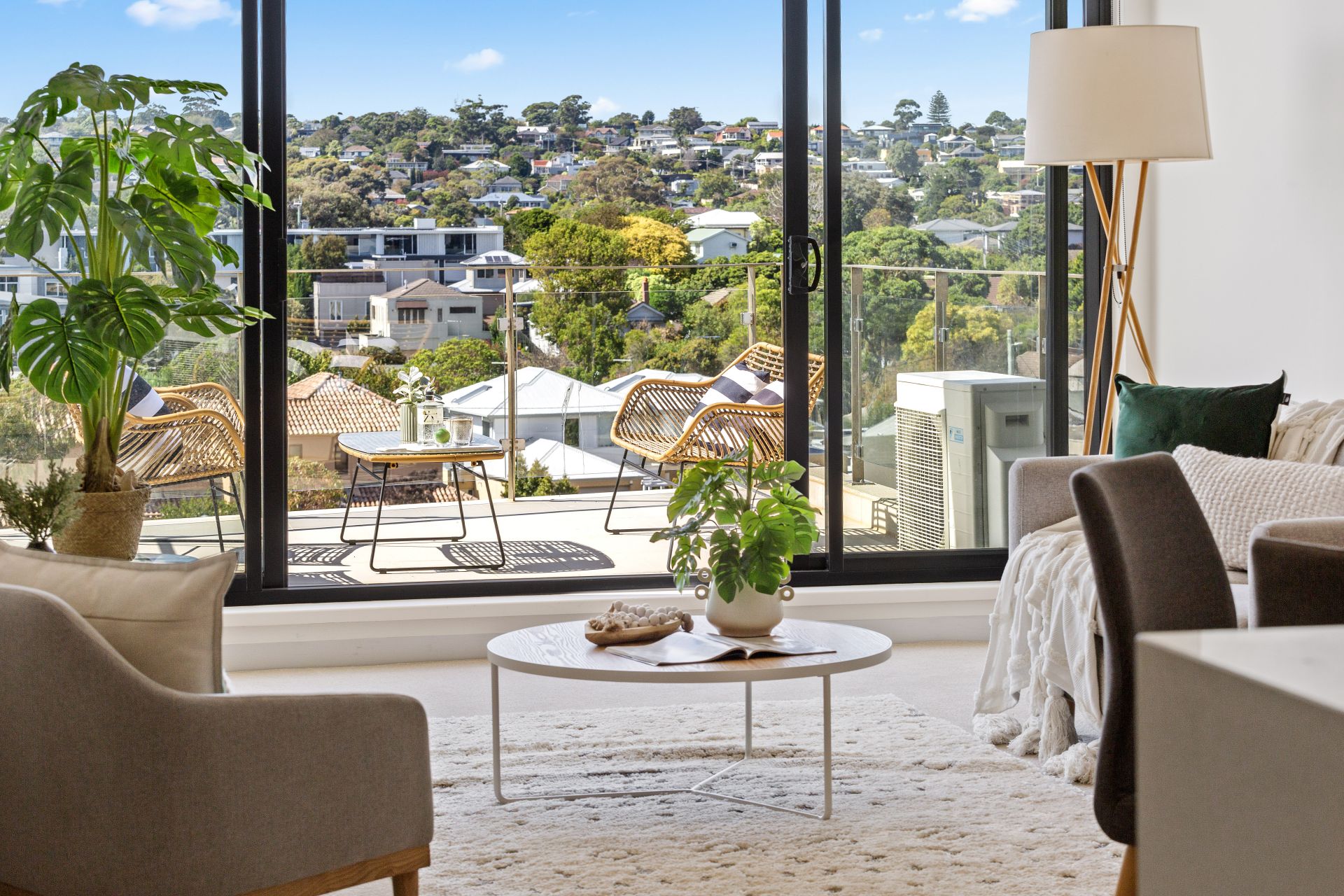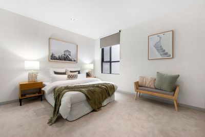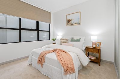 Bathed in natural light and infused with a serene seaside vibe, the 6.5-metre open-plan living and dining area seamlessly extends to a private balcony ideal for unwinding to water views and gentle bay breezes. Designed with both form and function in mind, the stylish kitchen features a cascading stone breakfast bar, wine shelving, sleek cream and woodgrain finishes, and premium Smeg appliances.