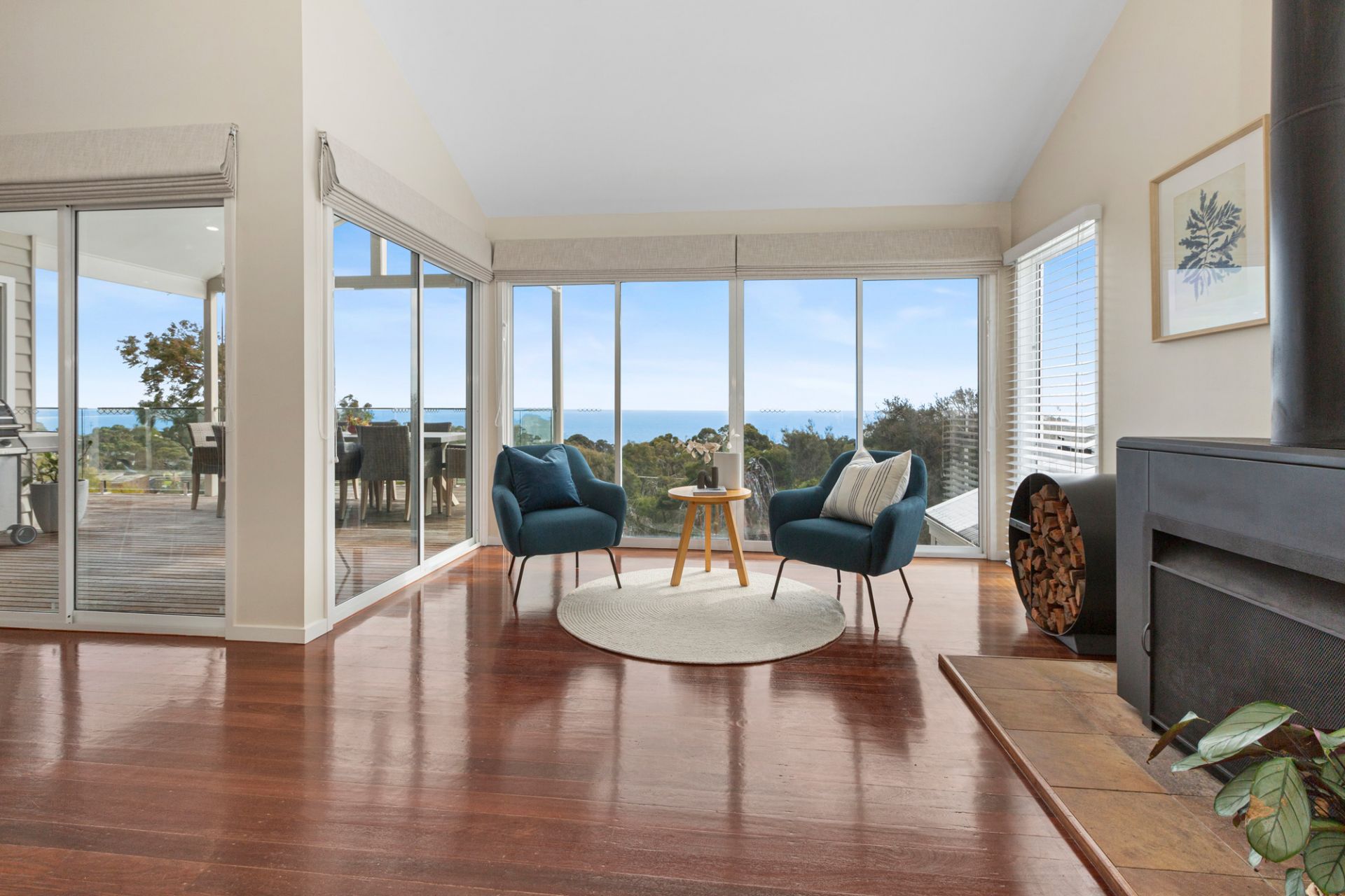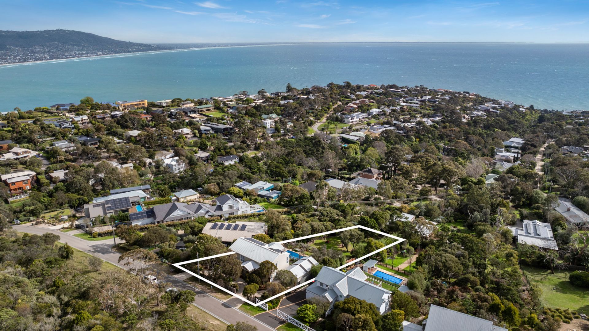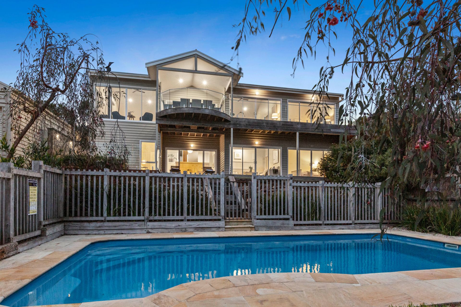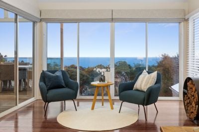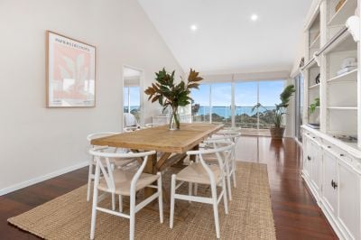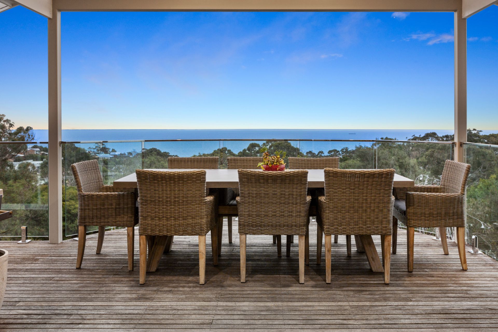 Relishing the beauty of the spectacular coastline from its position near the peak of Mt Martha, this four-bedroom weatherboard beautifully captures a magnificent bay panorama stretching from Portsea to the city skyline. Directly opposite Mt Martha Park’s walking tracks and minutes to the village, golf course, the beach and Martha Cove marina, the luxury home offers a choice of living areas over multiple levels, featuring Jarrah timber flooring, soaring cathedral ceilings and walls of glass that seamlessly merge indoor and outdoor spaces. Set on almost half an acre with park-like gardens, you can cool off with a dip in the pool, unwind in the outdoor spa, play a game of backyard cricket or entertain on the alfresco balcony with the spectacular water views as the backdrop. Flanked by windows taking in the vista, upstairs includes a sleek stone kitchen surrounded by spacious living and dining areas, and a stylish master suite, all with access to the expansive balcony. The lower level houses a children's zone with three bedrooms, a sparkling bathroom and two living zones.