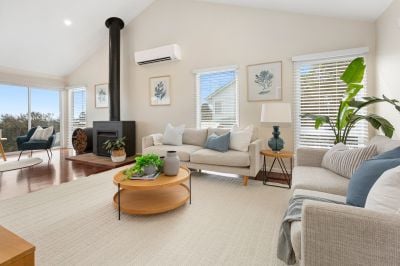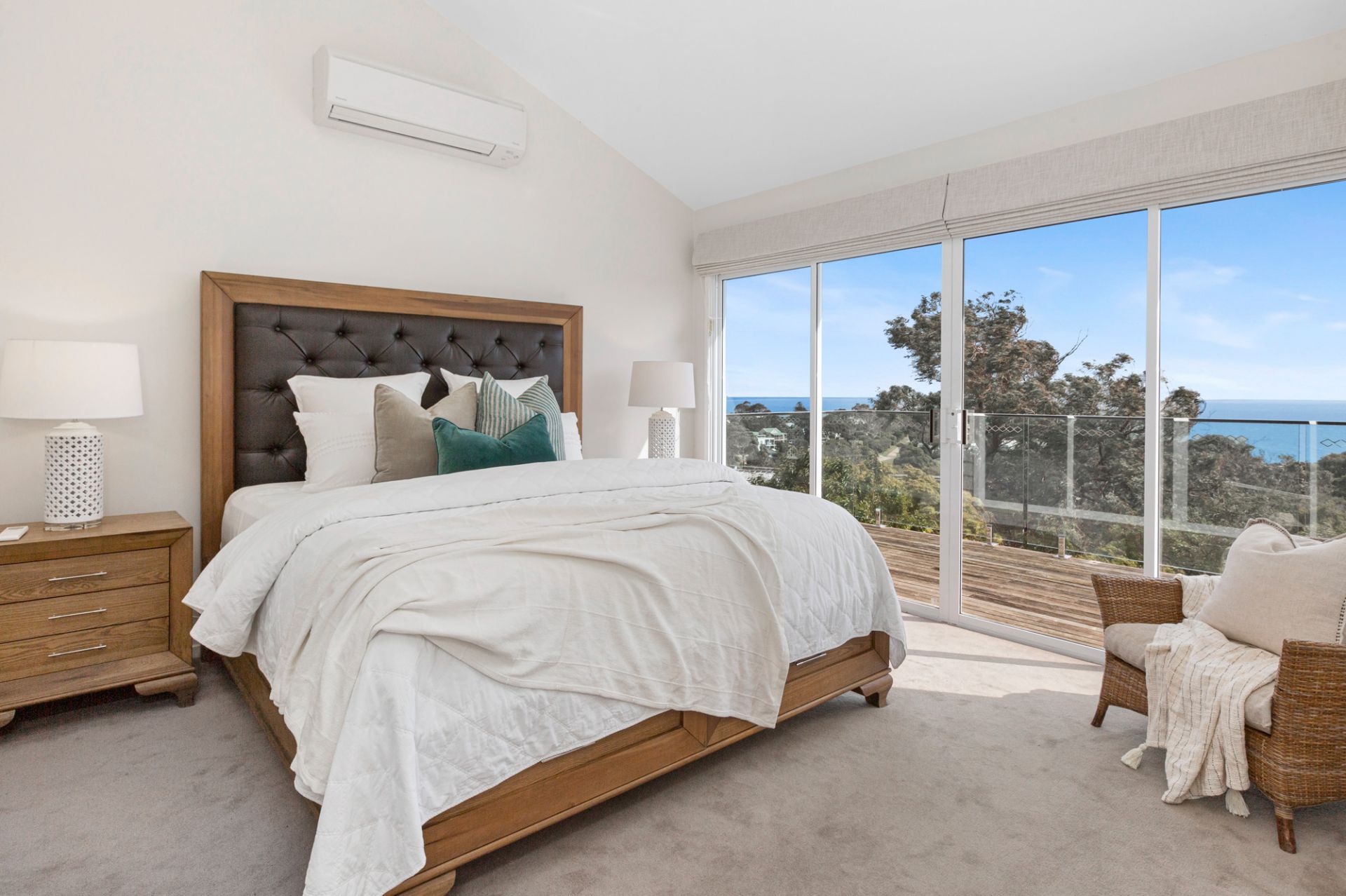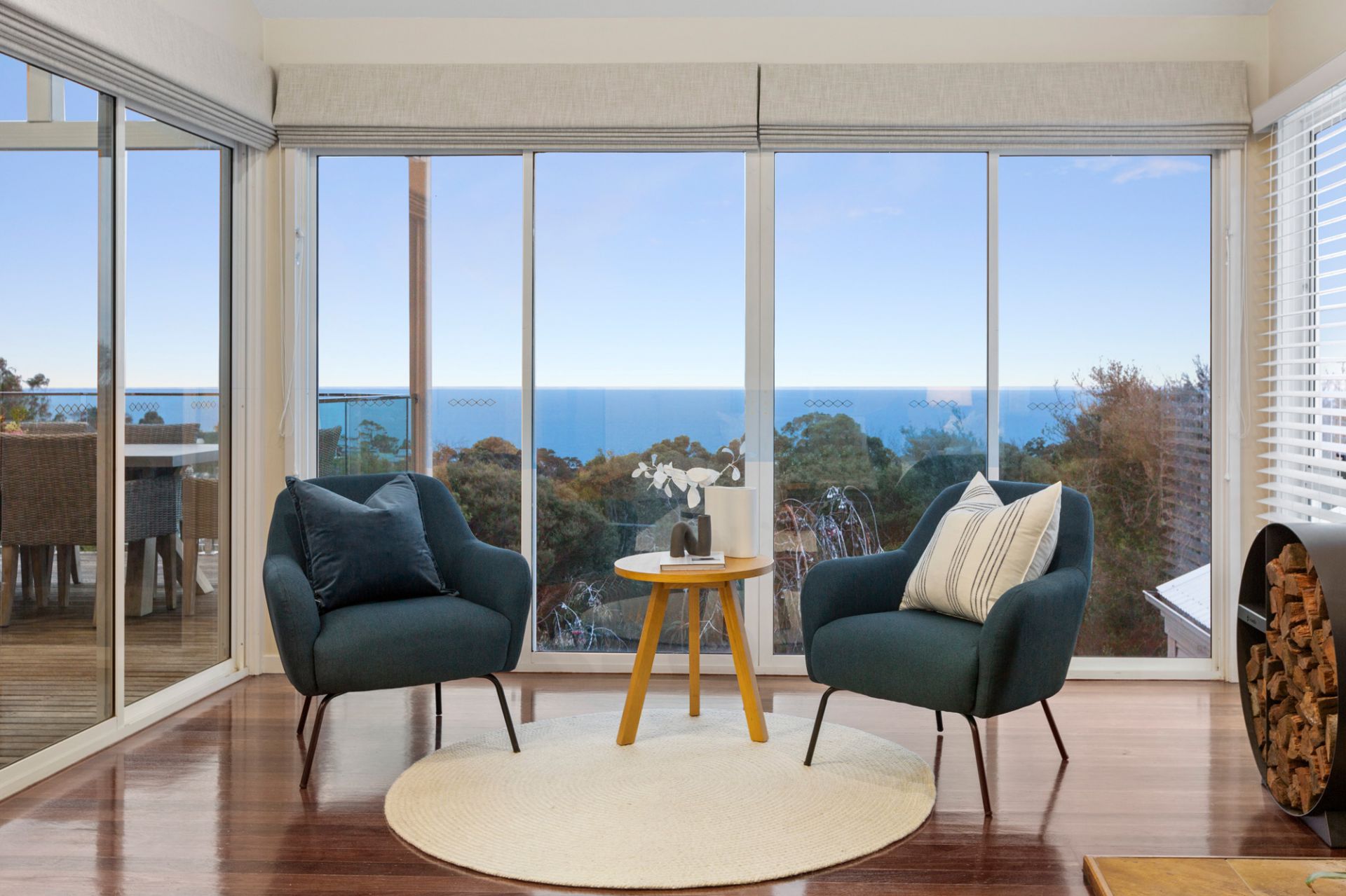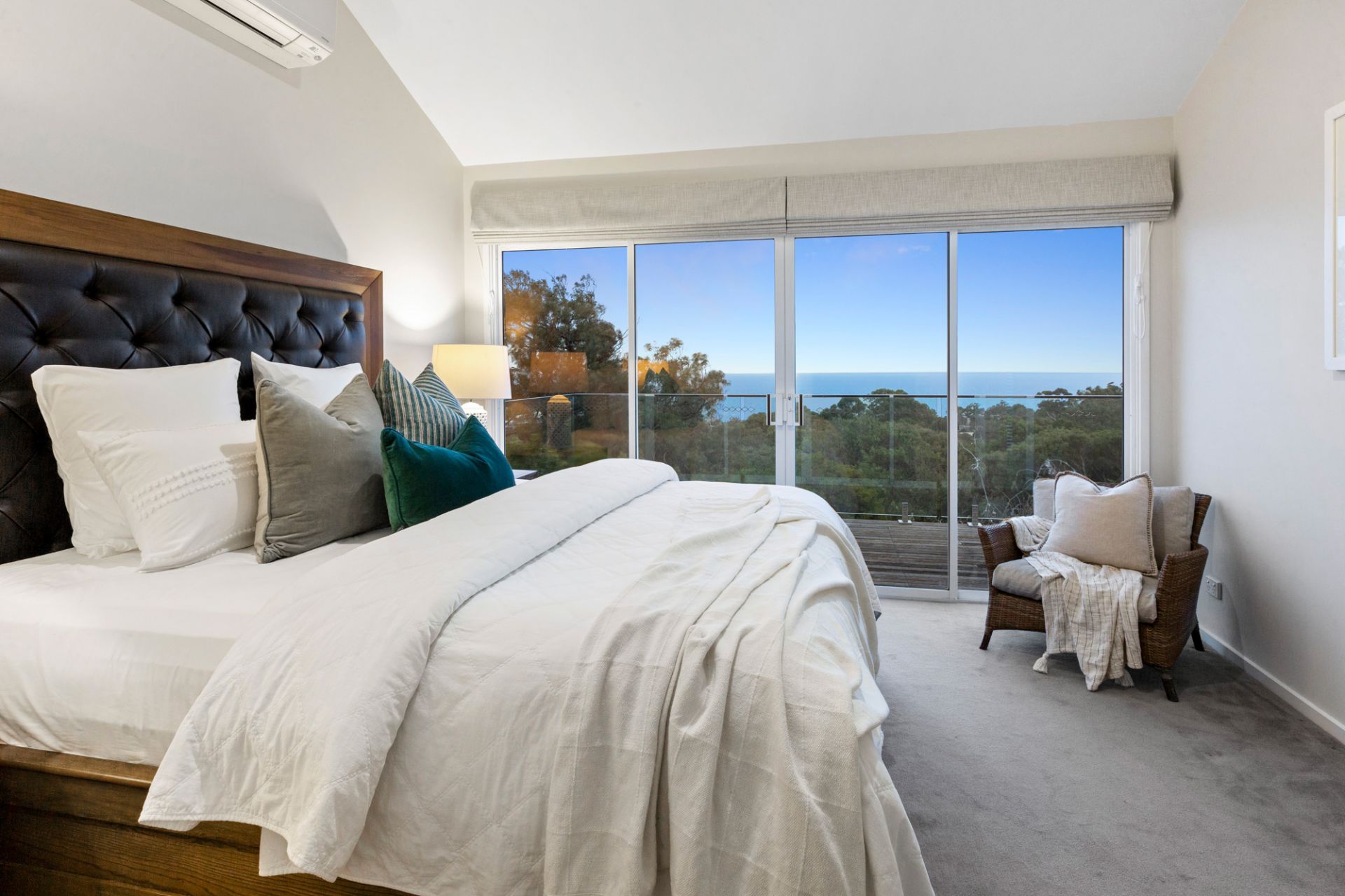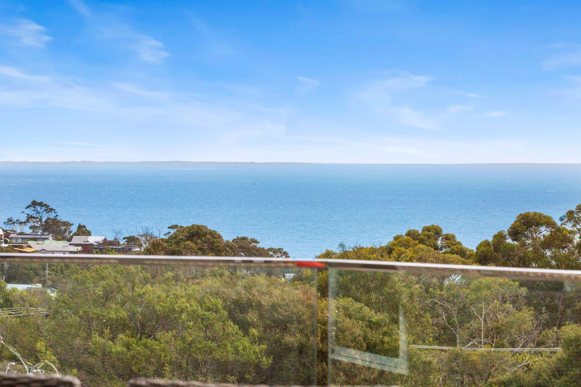 Relishing the beauty of the spectacular coastline from its position near the peak of Mt Martha, this four-bedroom weatherboard beautifully captures a magnificent bay panorama stretching from Portsea to the city skyline. Directly opposite Mt Martha Park’s walking tracks and minutes to the village, golf course, the beach and Martha Cove marina, the luxury home offers a choice of living areas over multiple levels, featuring Jarrah timber flooring, soaring cathedral ceilings and walls of glass that seamlessly merge indoor and outdoor spaces. Set on almost half an acre with park-like gardens, you can cool off with a dip in the pool, unwind in the outdoor spa, play a game of backyard cricket or entertain on the alfresco balcony with the spectacular water views as the backdrop. Flanked by windows taking in the vista, upstairs includes a sleek stone kitchen surrounded by spacious living and dining areas, and a stylish master suite, all with access to the expansive balcony. The lower level houses a children's zone with three bedrooms, a sparkling bathroom and two living zones.