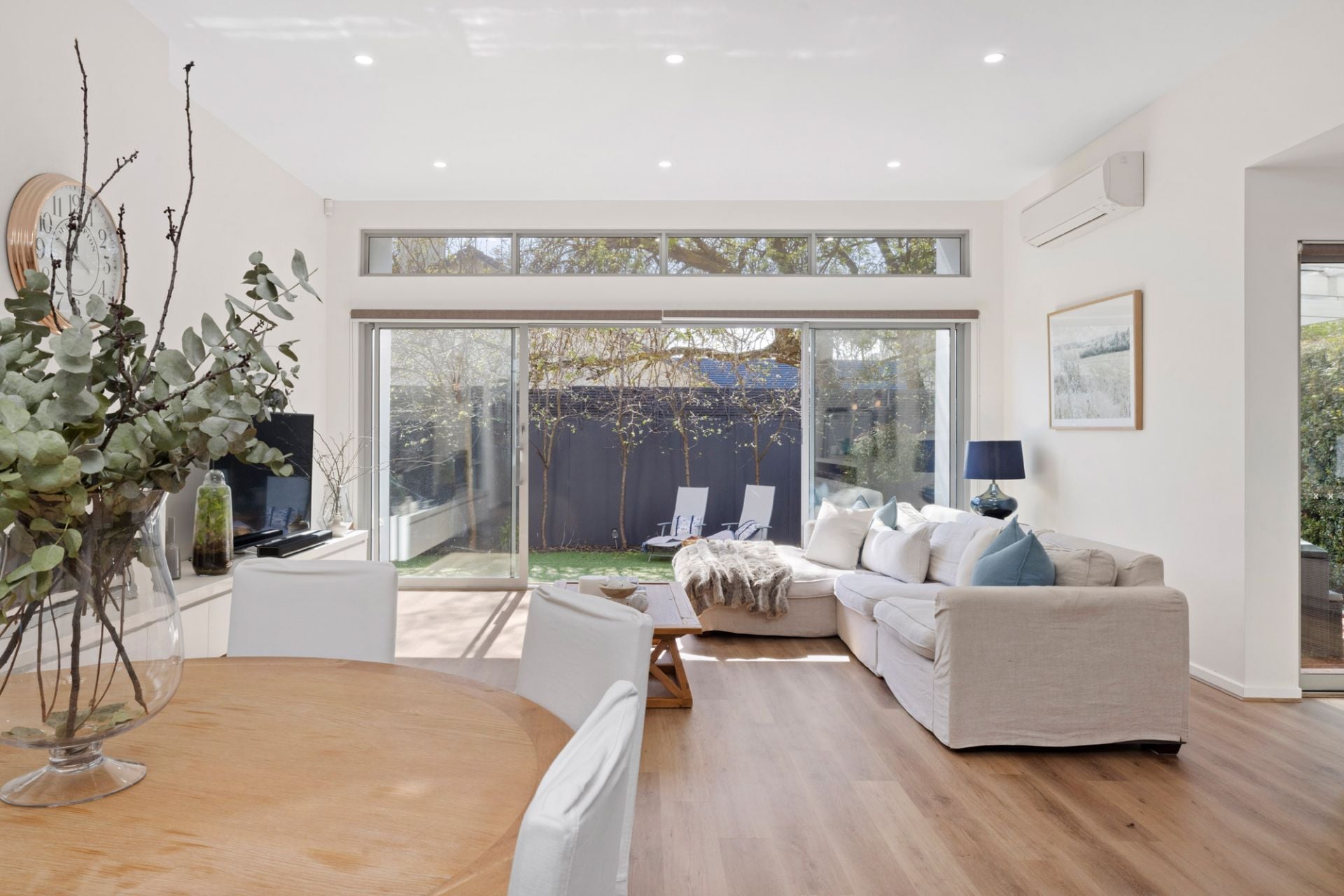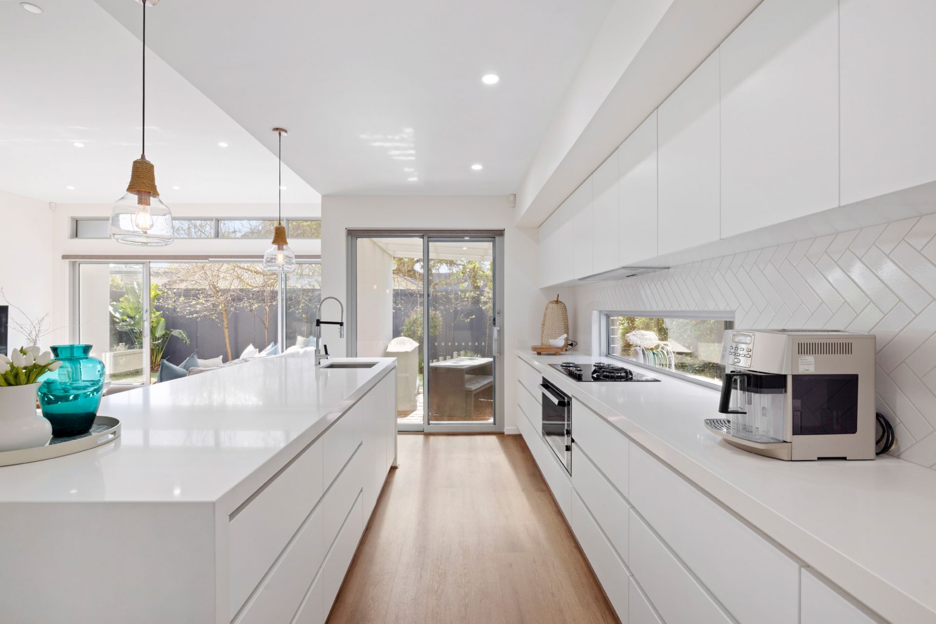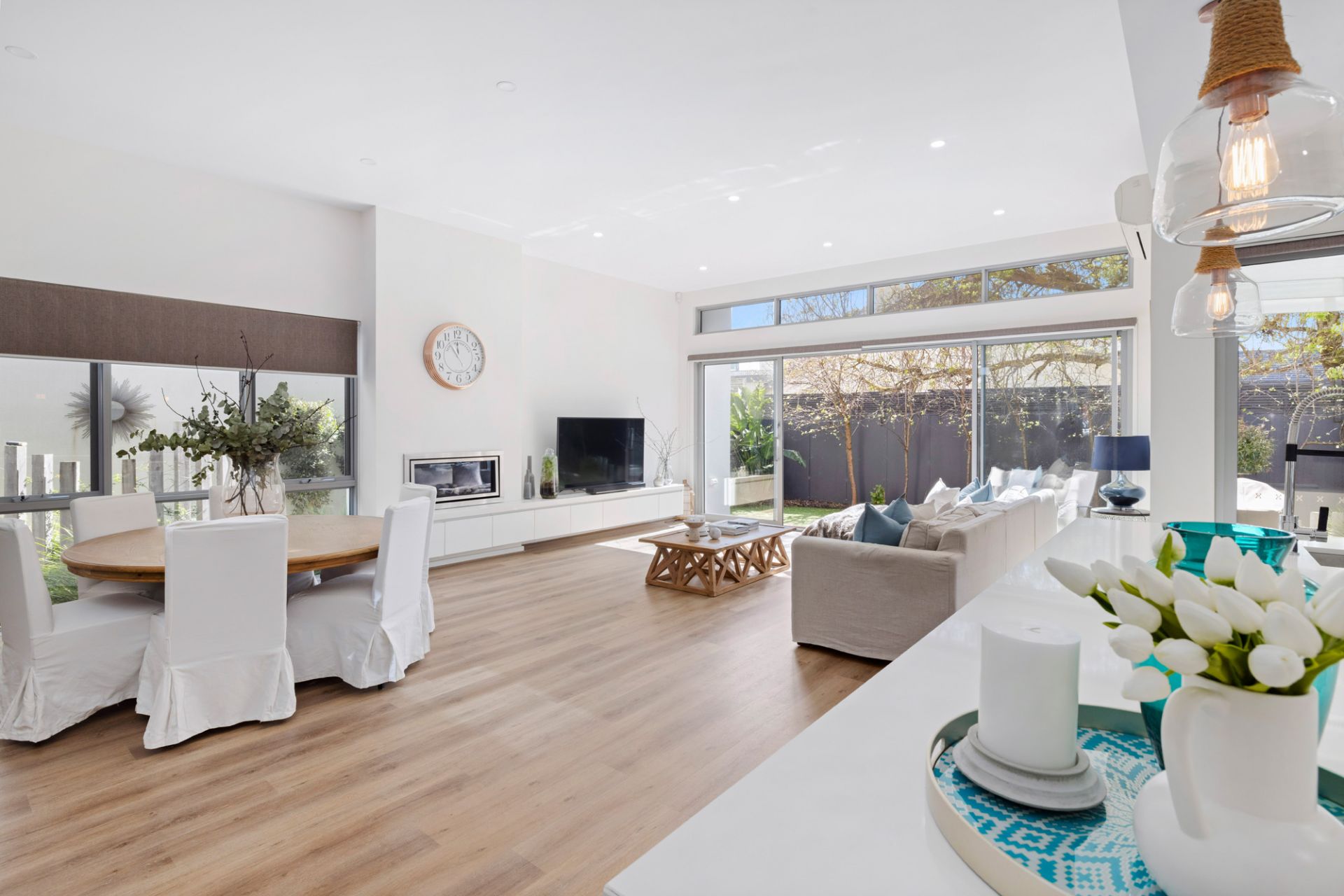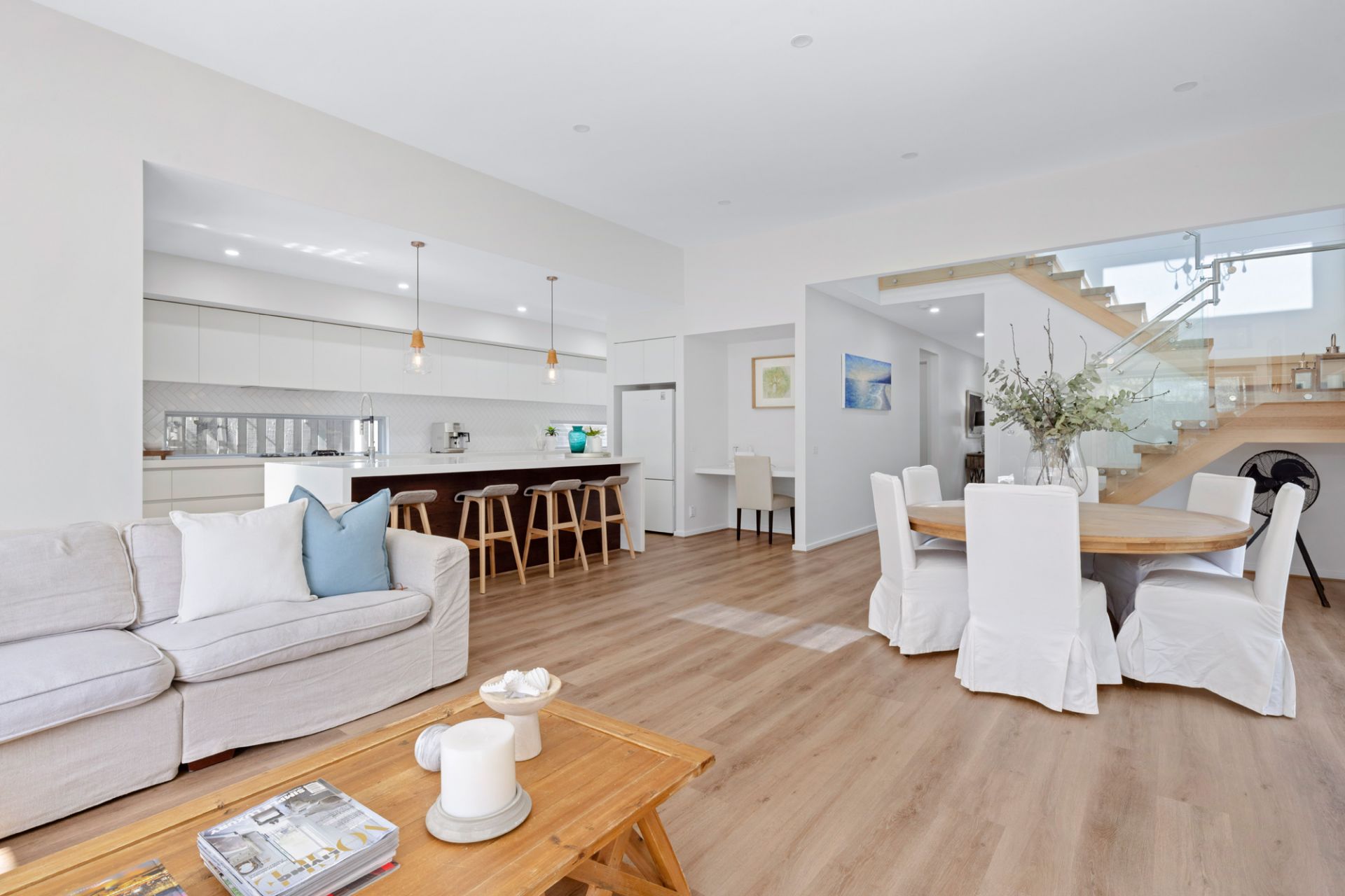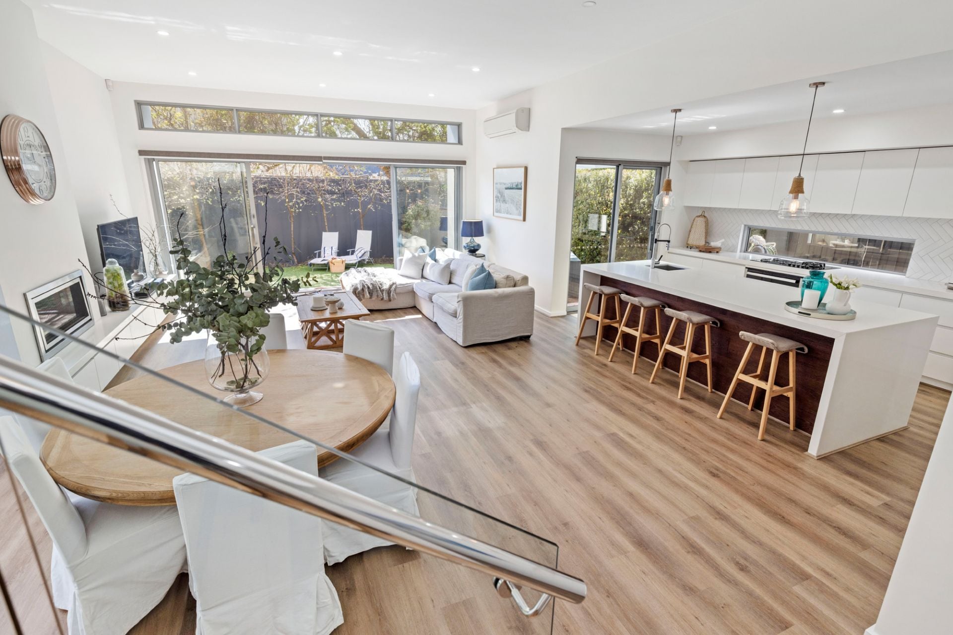 Set within landscape-designed low-maintenance native-inspired gardens, the double-storey home will impress with its striking architectural presence in this prized contemporary beachside cul-de-sac. With secure video intercom entry, the entry hall reveals newly laid Engineered oak flooring and freshly painted walls. Natural light draws you towards the north-facing open-plan living area where garden-facing glass sliding doors, clerestory windows, and an open timber staircase with a glass balustrade enhance the soaring dimensions, further enriched with a gas pebble fireplace built into stone-topped joinery. Defined by sleek white cabinetry matched with gleaming stone benchtops, the gourmet kitchen is designed for effortless entertaining and features a De’Longhi gas cooktop and oven, an integrated dishwasher and ducted kicker-vac vents. The kitchen space extends to the laundry/butler’s pantry with external access, and a built-in study nook further complements the well-considered liveability.