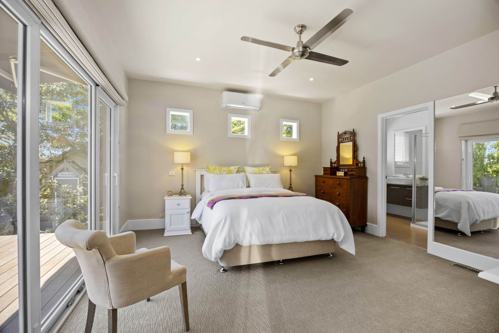 - Main bedroom with European swing windows opening out to the deck