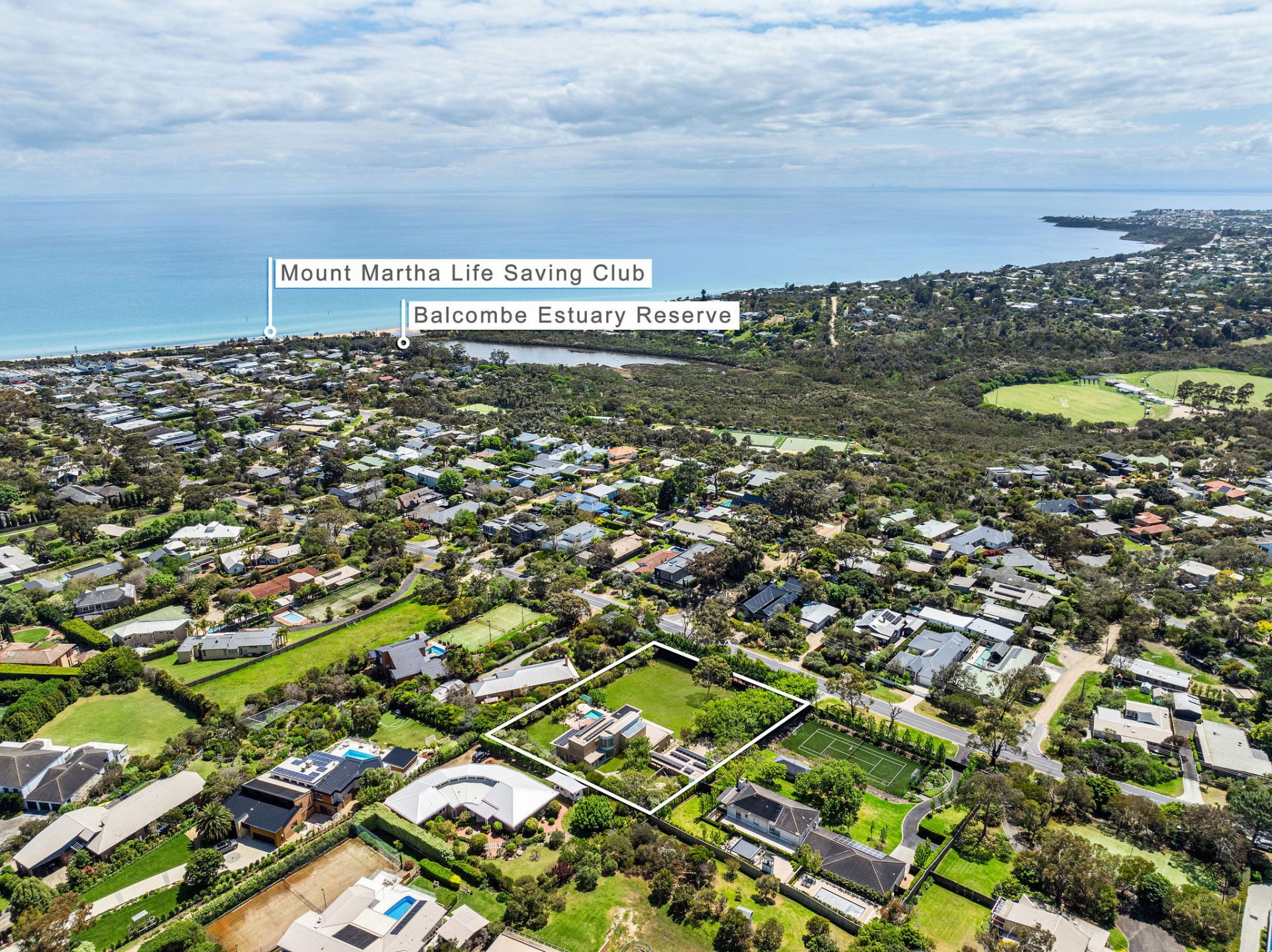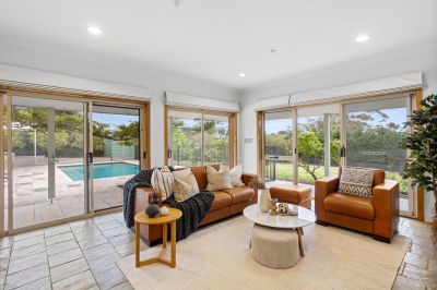 Flaunting a spectacular split-level design with glistening bay views and a premier position, this exquisite four-bedroom home featuring four living areas, a home office and heated swimming pool marries architect-designed elegance with laidback coastal chic. Footsteps from the village cafes and Mt Martha's stunning South Beach, Winbirra is veiled behind tall privacy hedges with zoned lawns, a silver birch grove and an array of exotic fruit trees, while the rare 3541sqm (approx) parcel offers ample room to add a full-sized tennis court, or subdivide in the future (STCA).