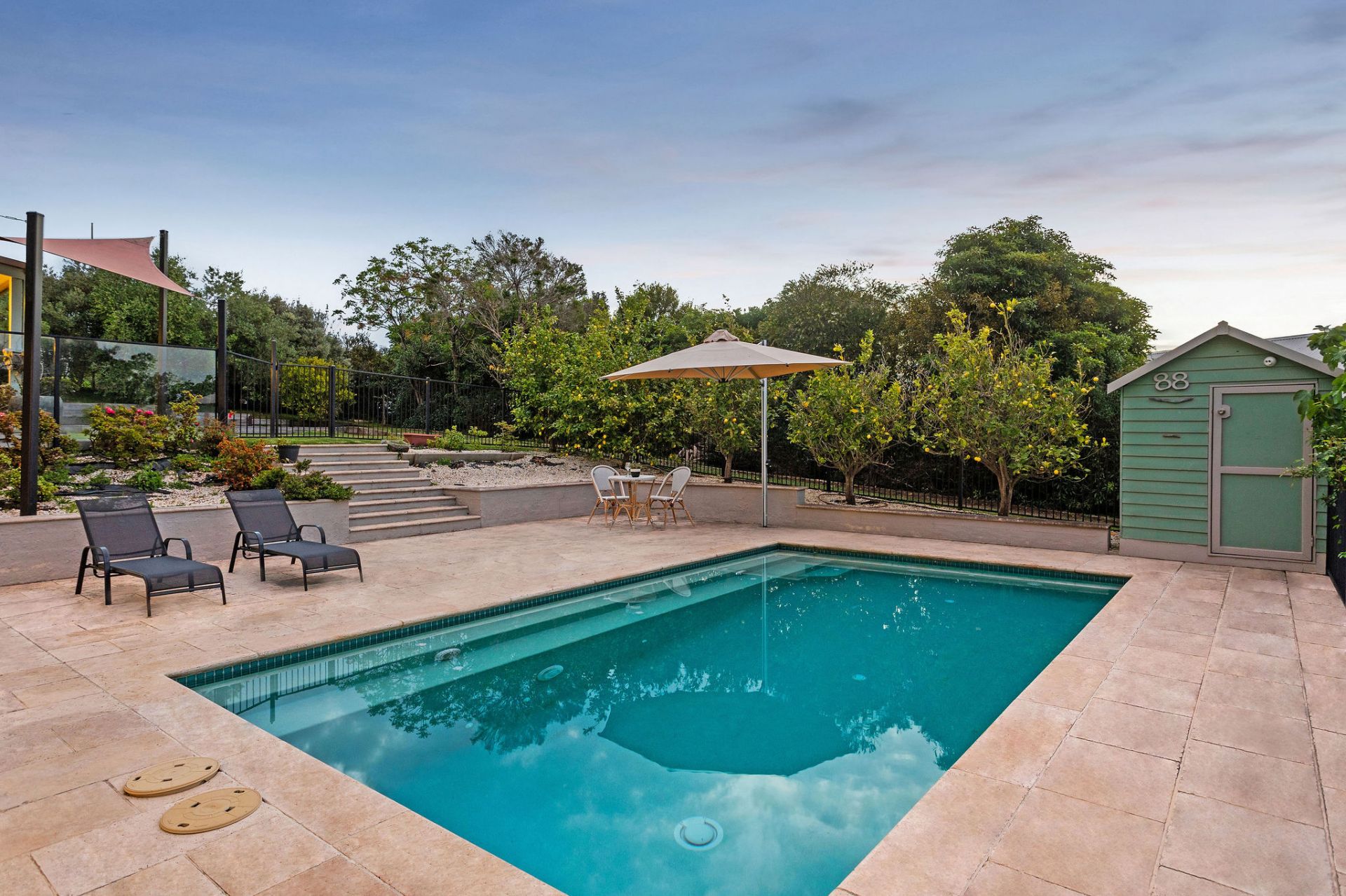 - Zoned lawns, silver birch grove and olive, lemon, fig and cumquat trees
